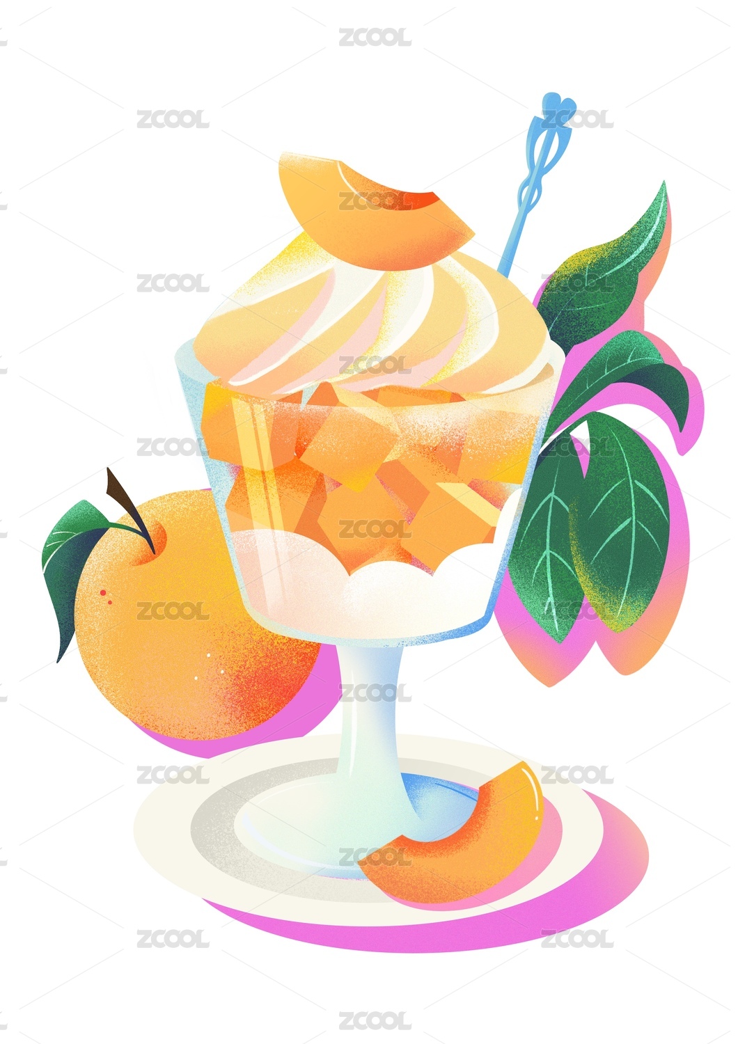 芒果黄桃奶油冰激凌水果甜品蛋糕美食插画