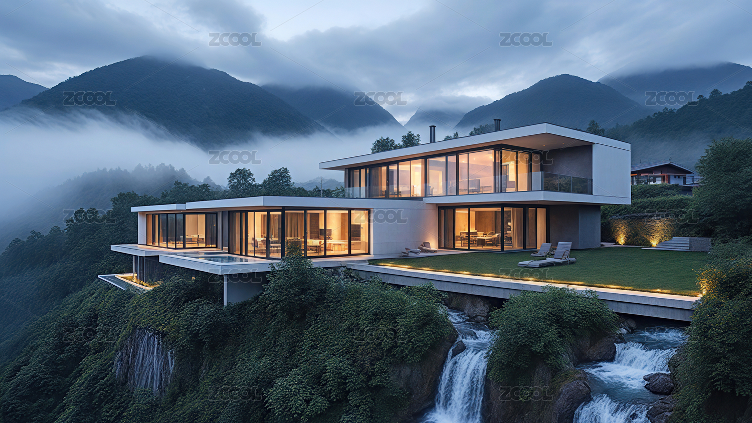AIGC202402,别墅,现代,简约,山景,风景,背景