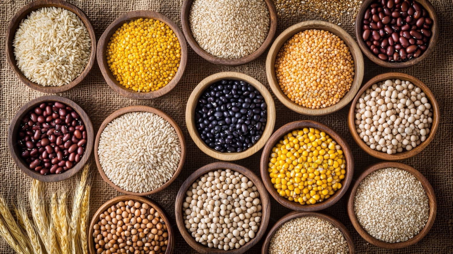 俯拍放在桌上的各种五谷豆类食材围着锅