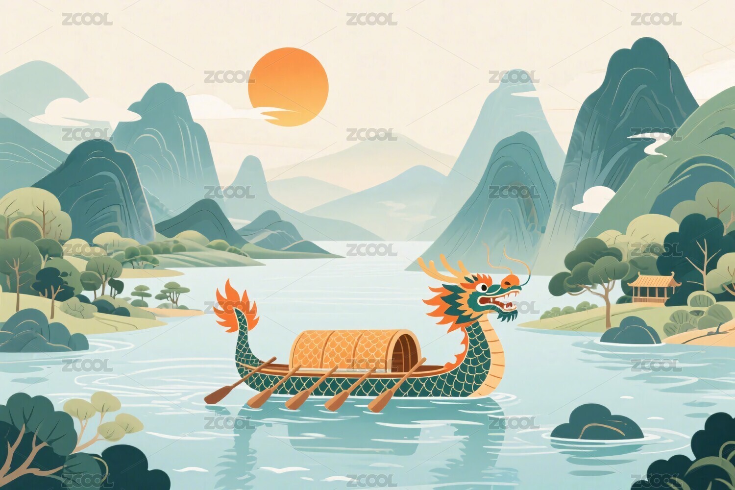 国潮传统端午节粽子击鼓龙舟远山和海浪
