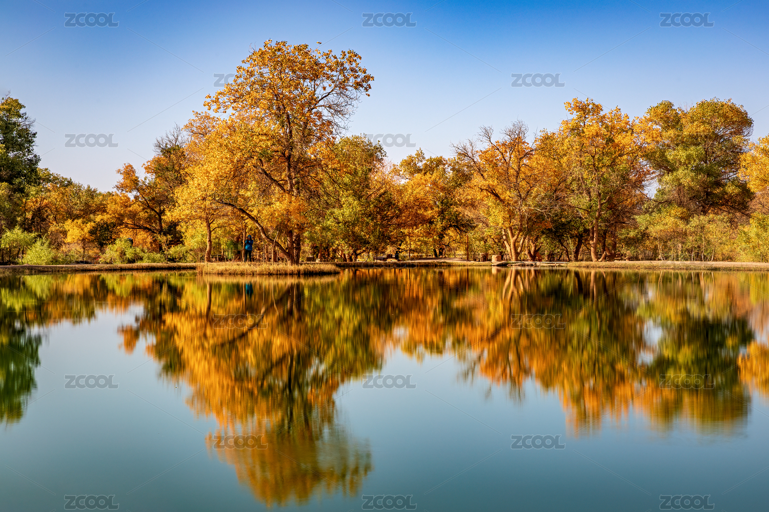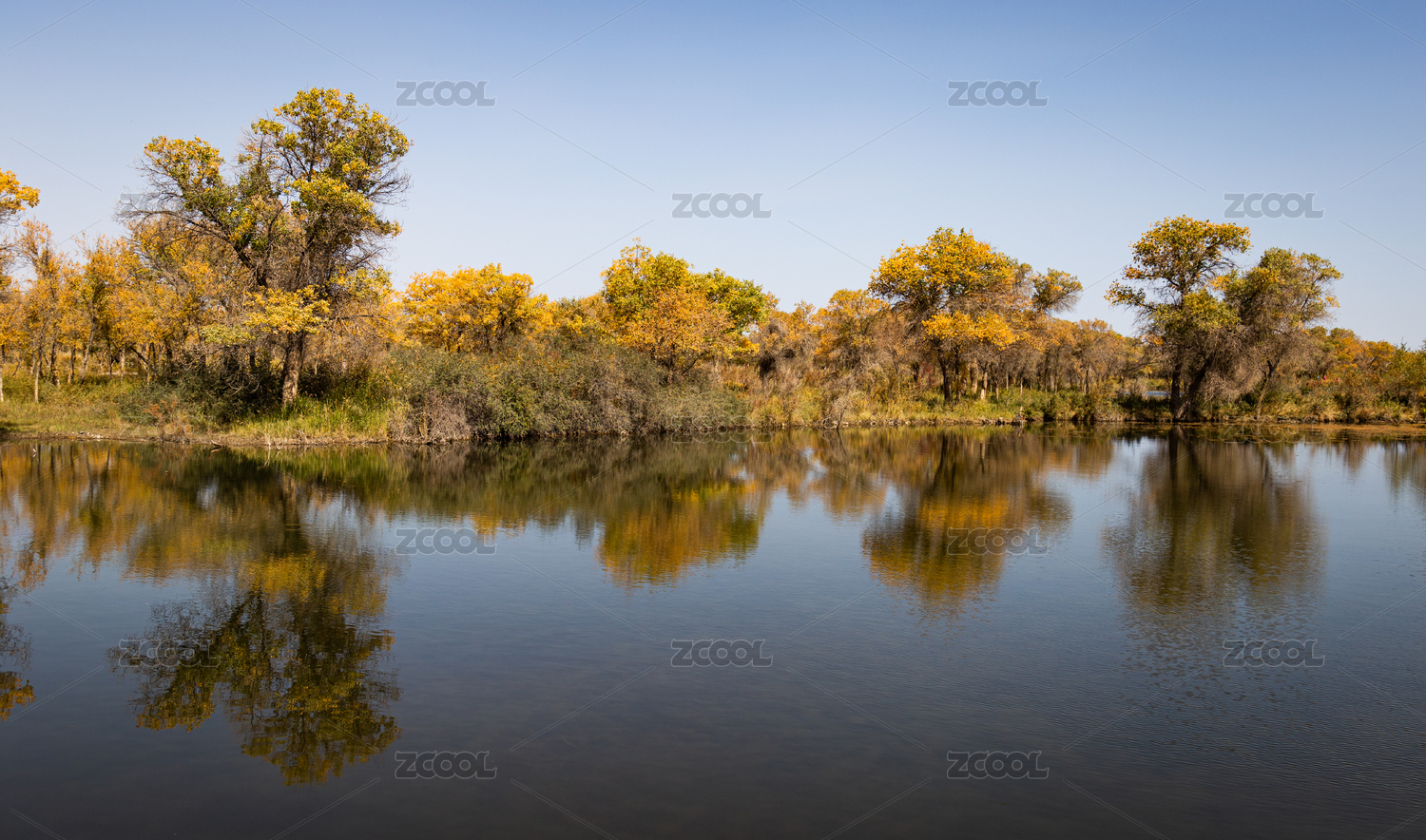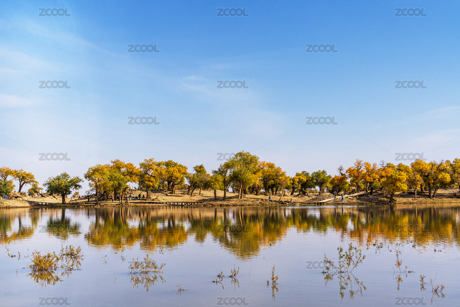 中国内蒙额济纳旗秋天湖边金色胡杨林风光