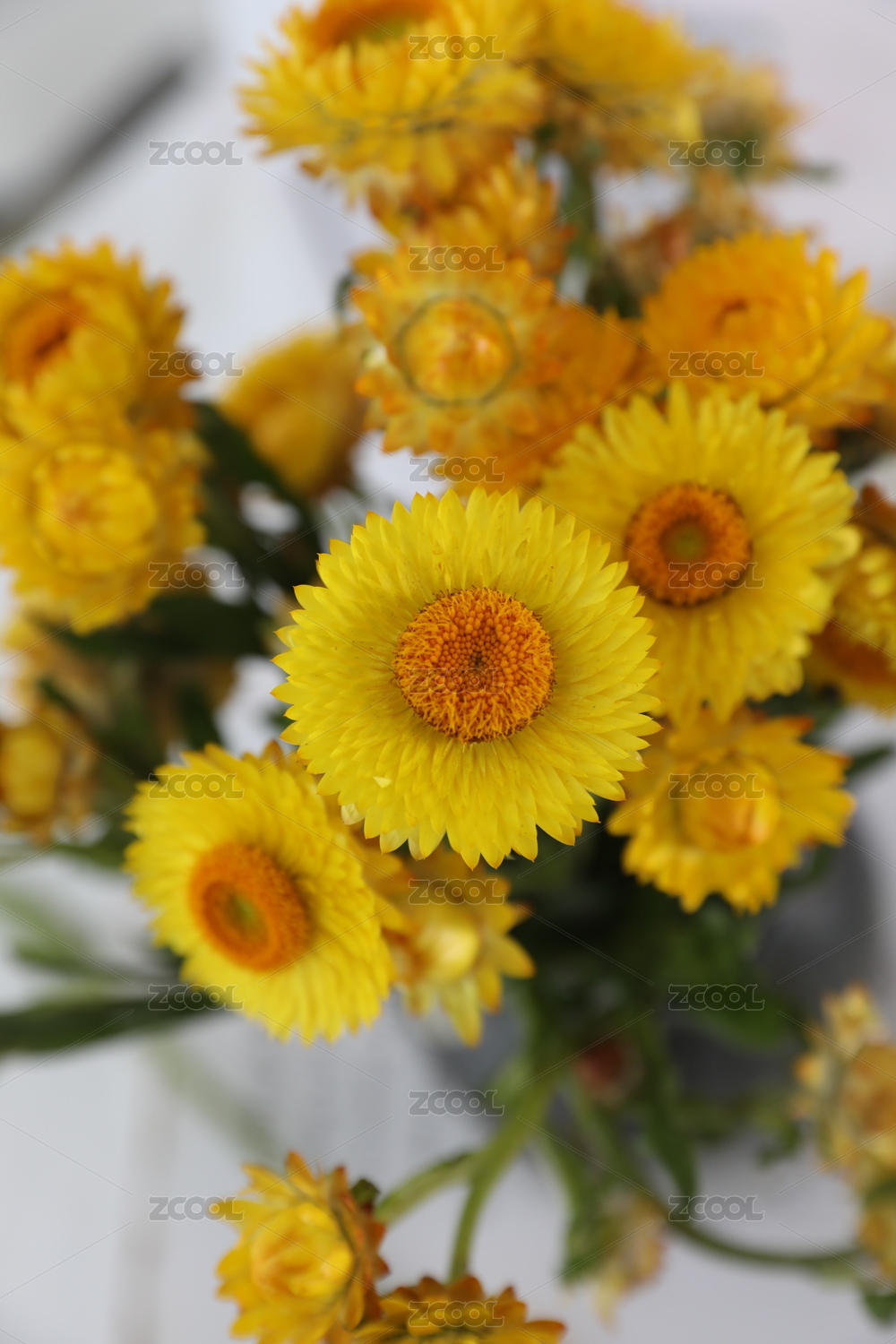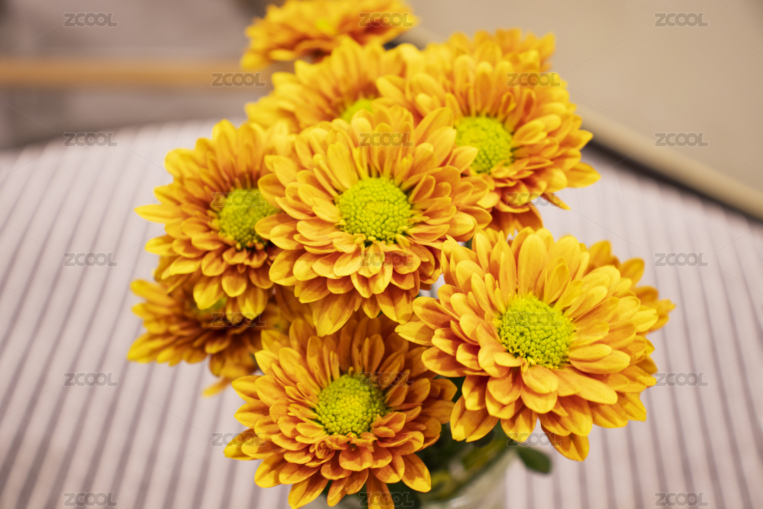 灰白条纹桌布的桌子上放着一束黄色雏菊