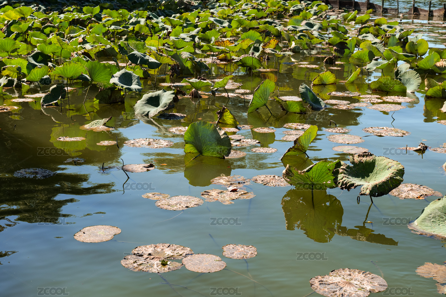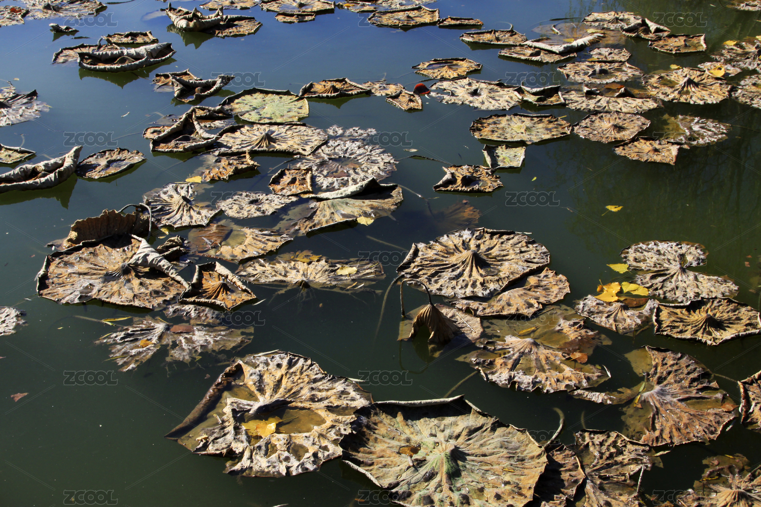 池塘中漂浮的枯萎荷叶
