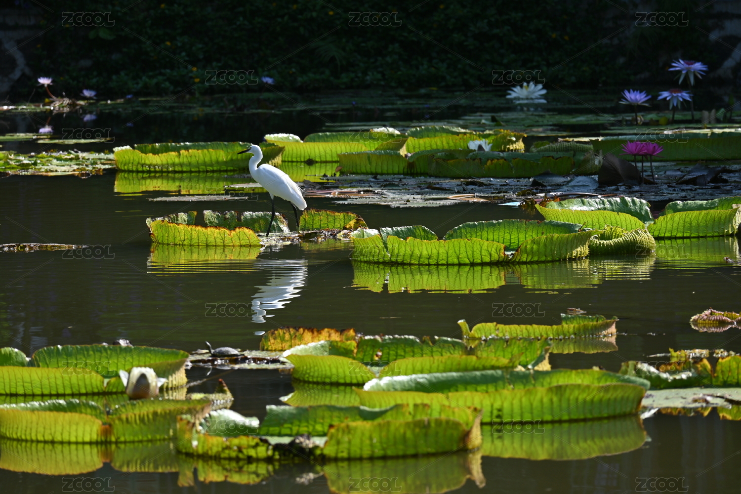 一只白鹭站立在王莲叶片上