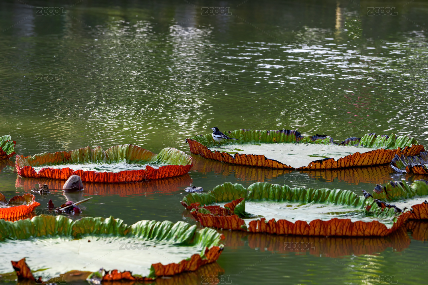 池塘里一只鸟站在巨大荷叶上