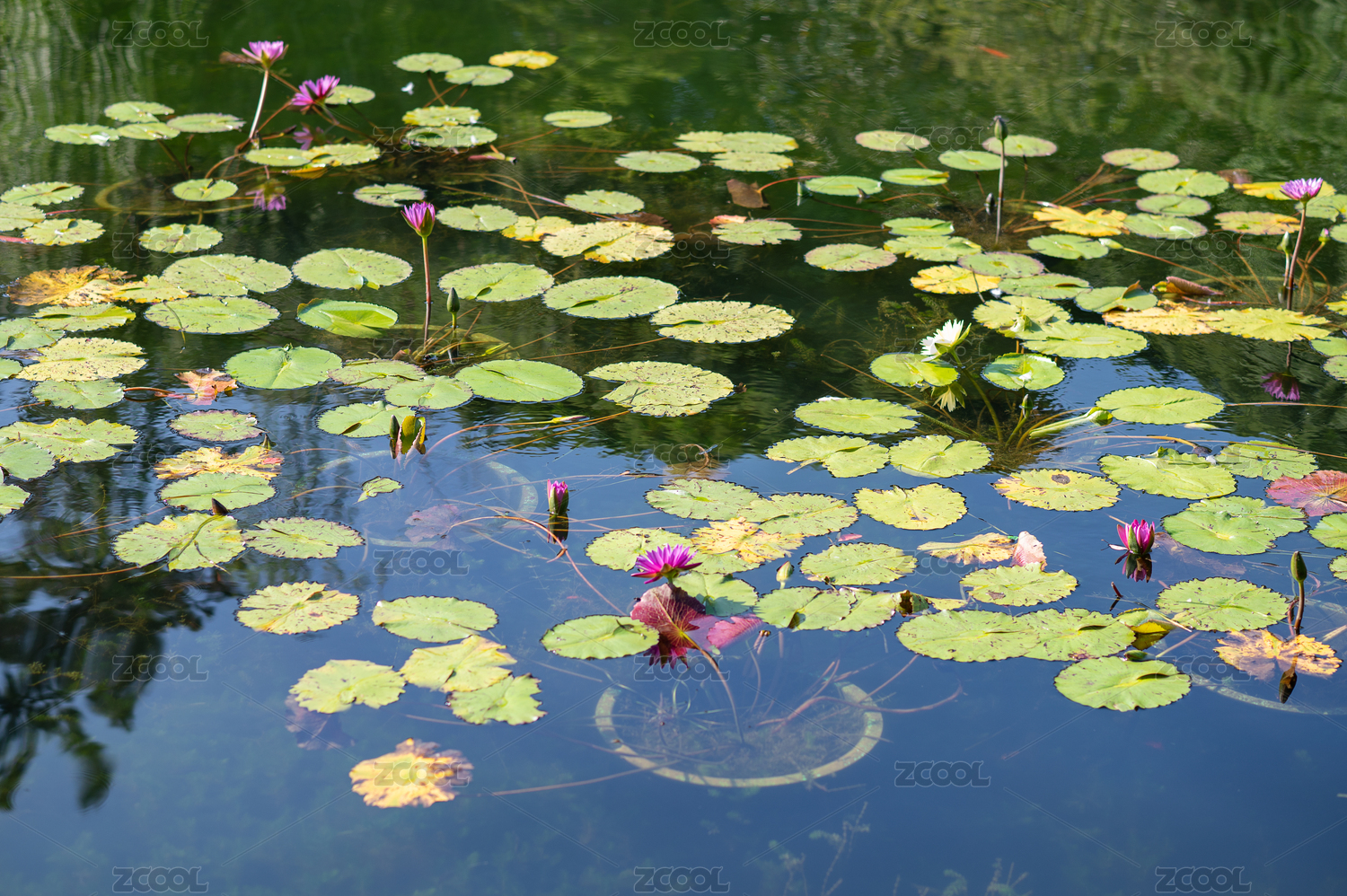 清晨阳光下池塘里的睡莲倒影
