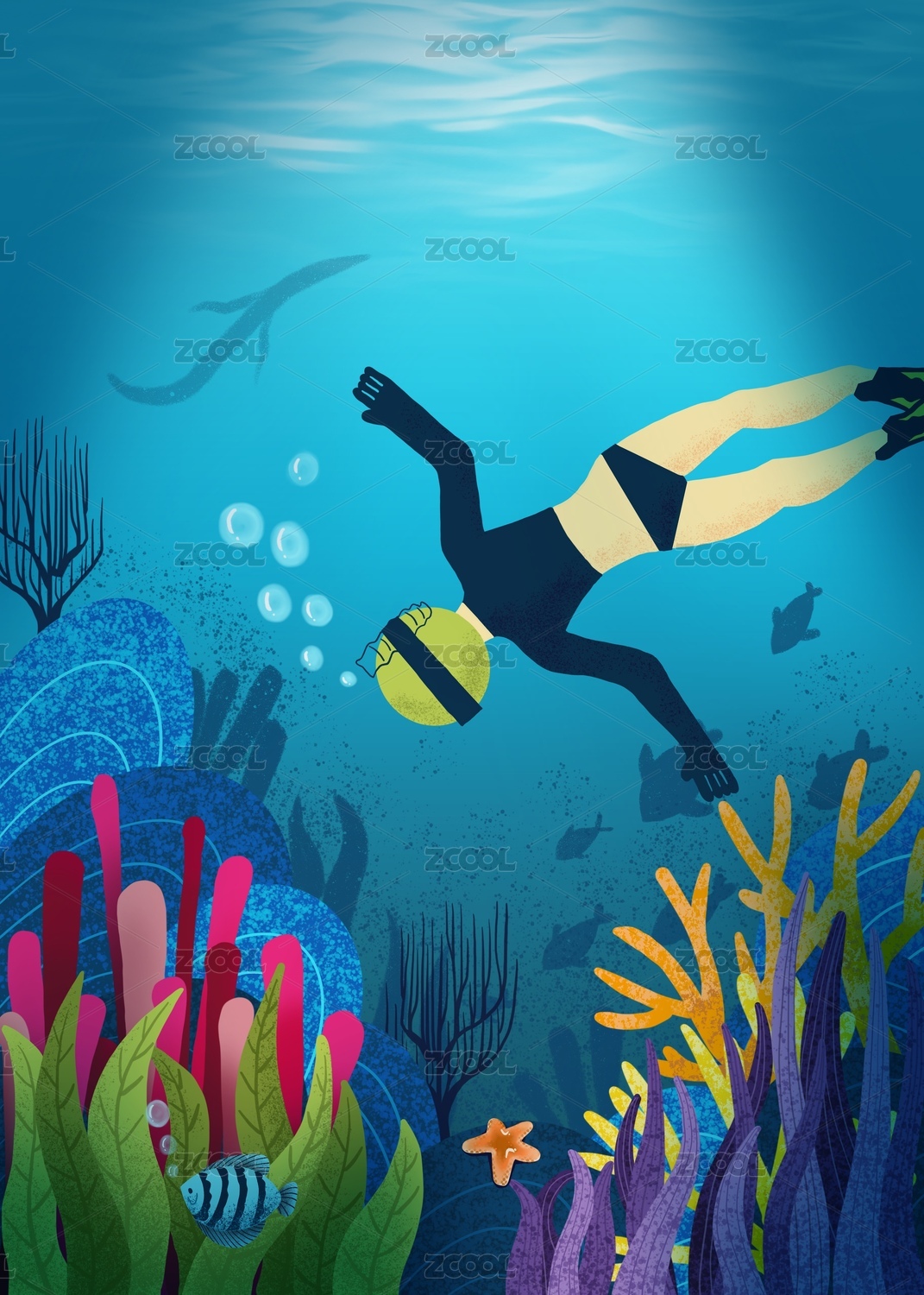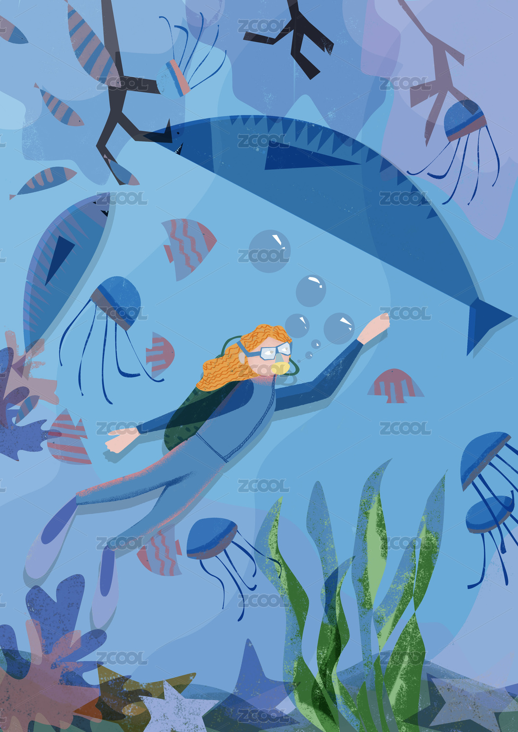 长发女孩在海洋里潜水周身围绕着海洋生物