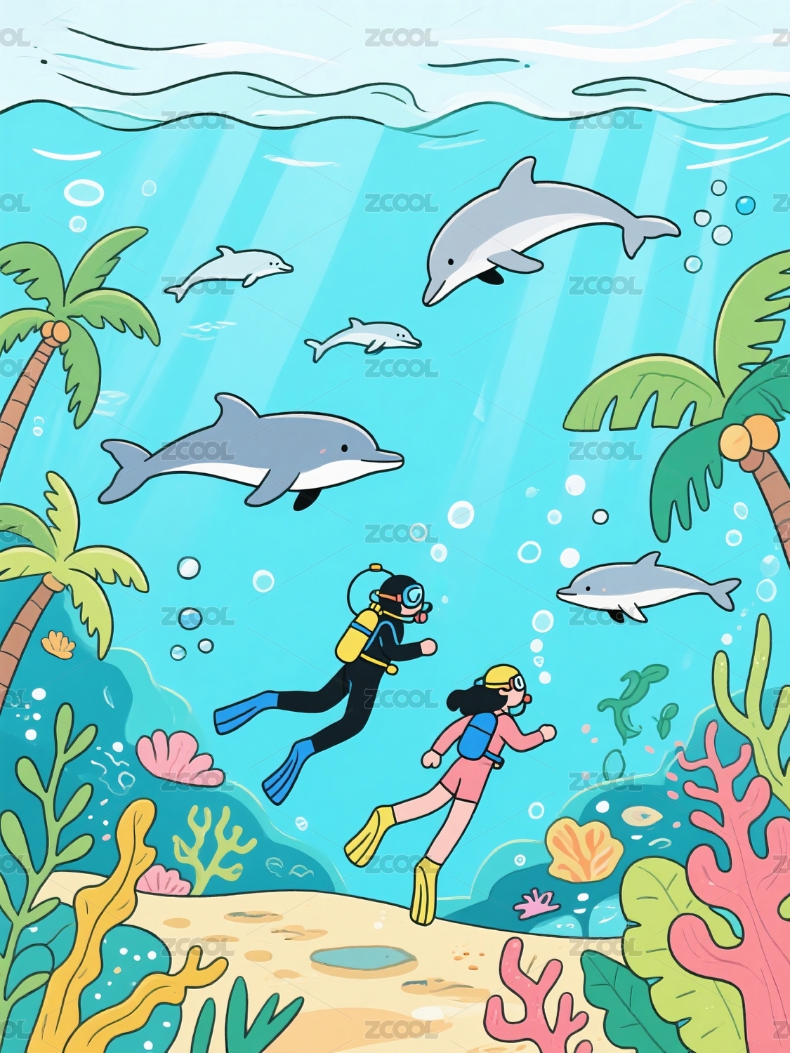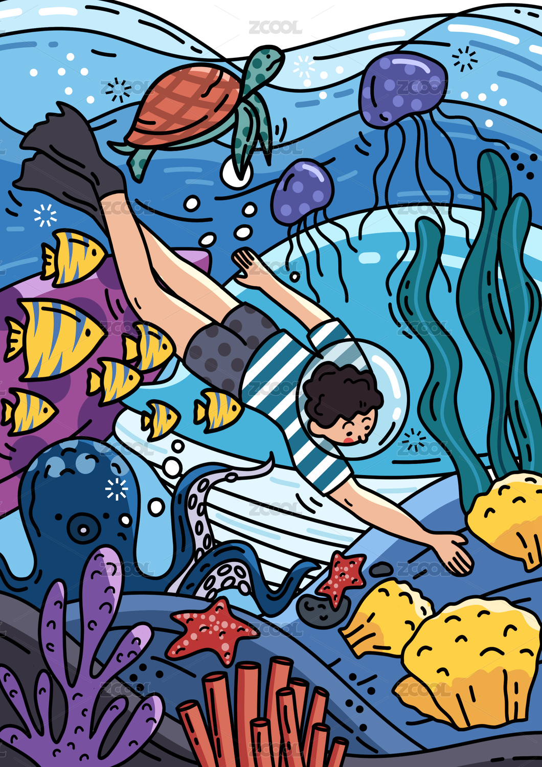儿童教育插画小猴子和小兔子戴着潜水面具在