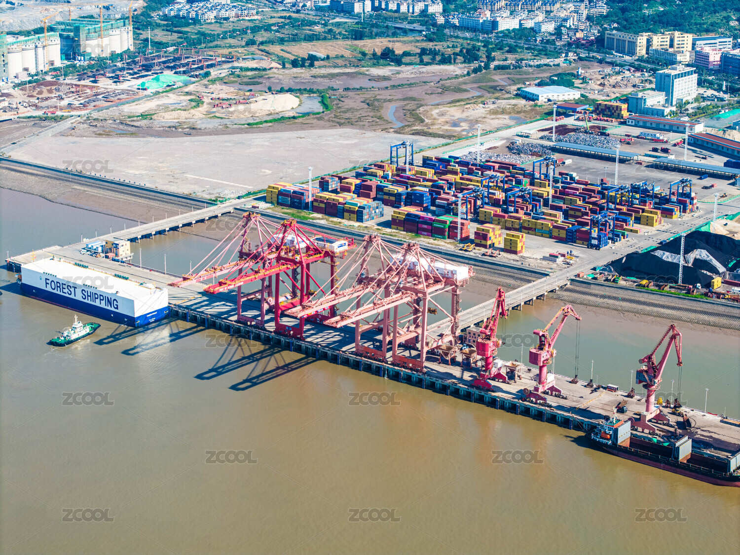 俯瞰福建泉州湾大型集装箱港口和海湾风景