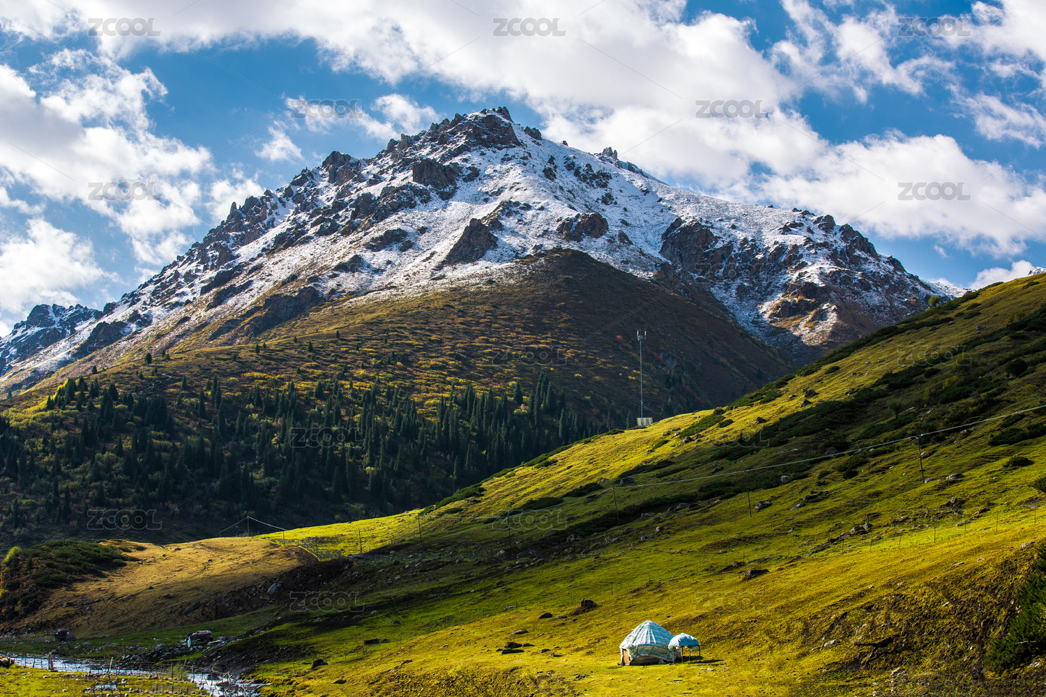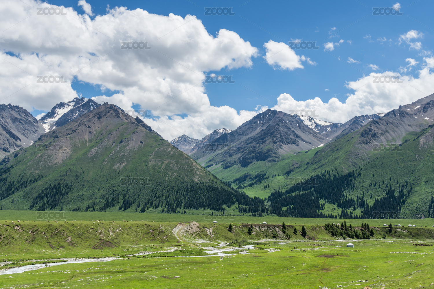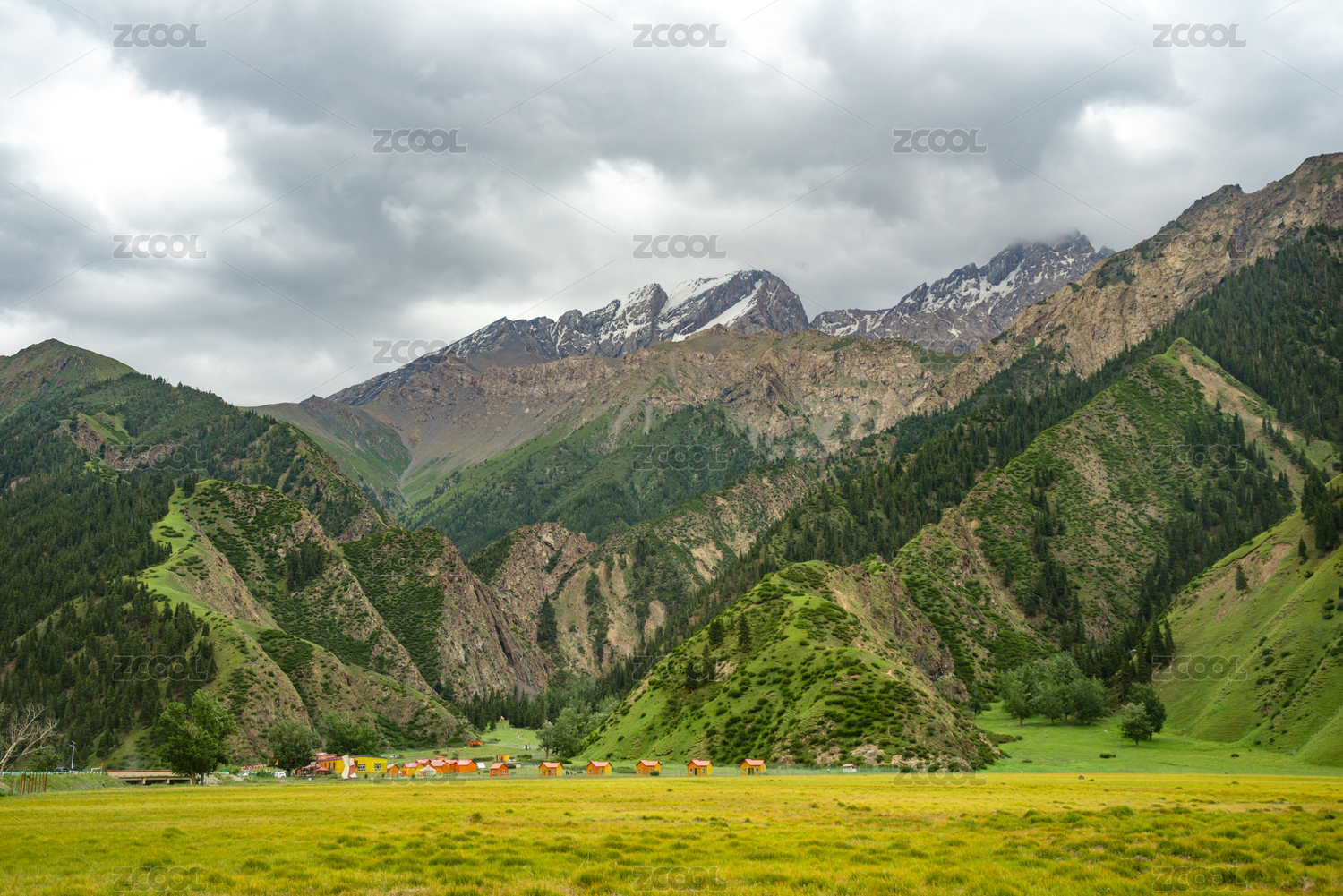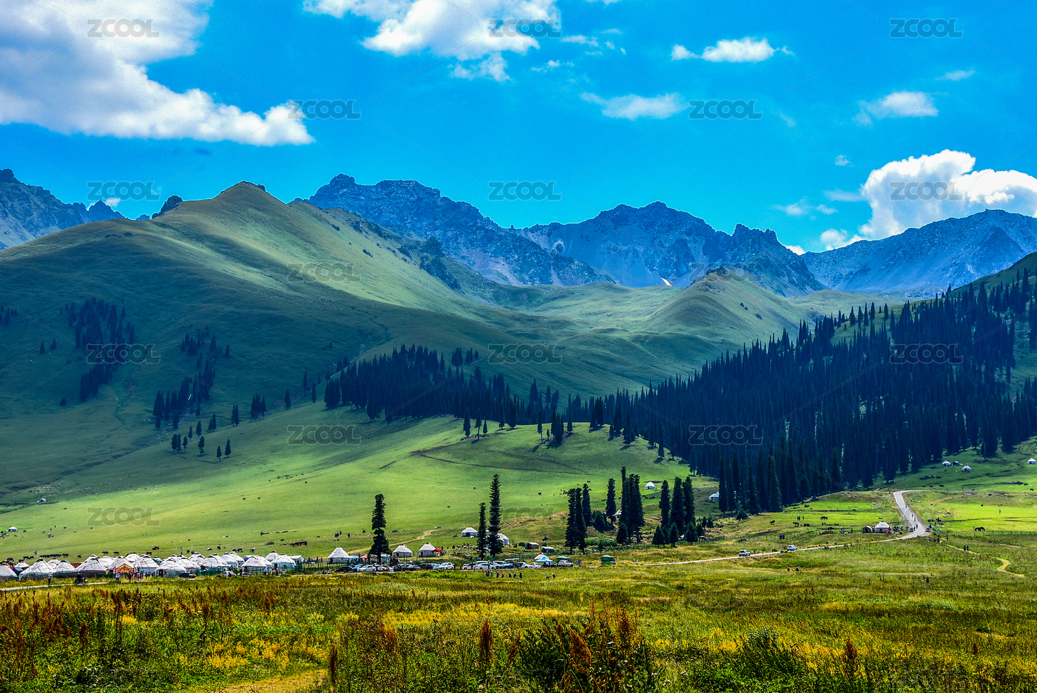中国新疆下塔风景区雄伟的山脉和绿色的草原