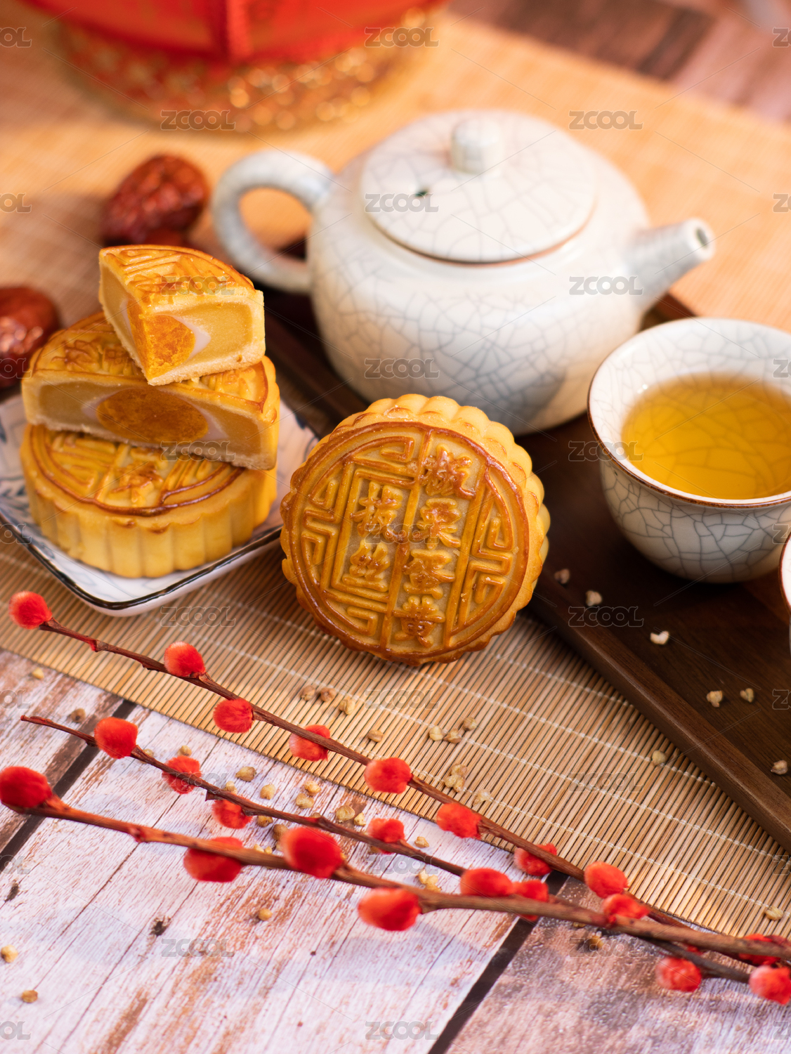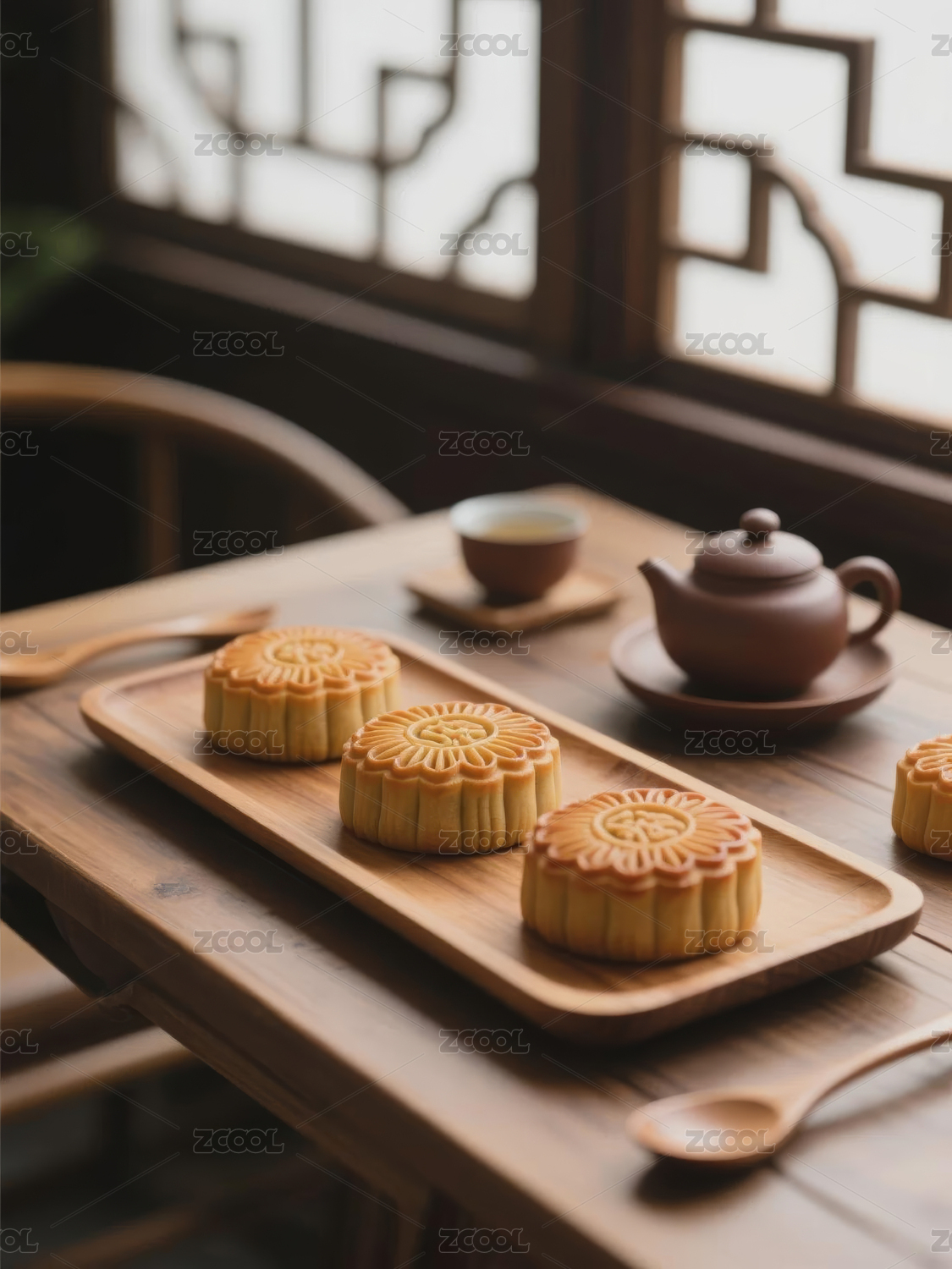 一盘中秋月饼放在中式场景的木质感的桌面上
