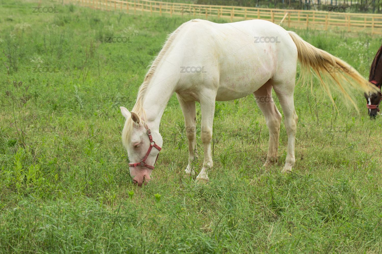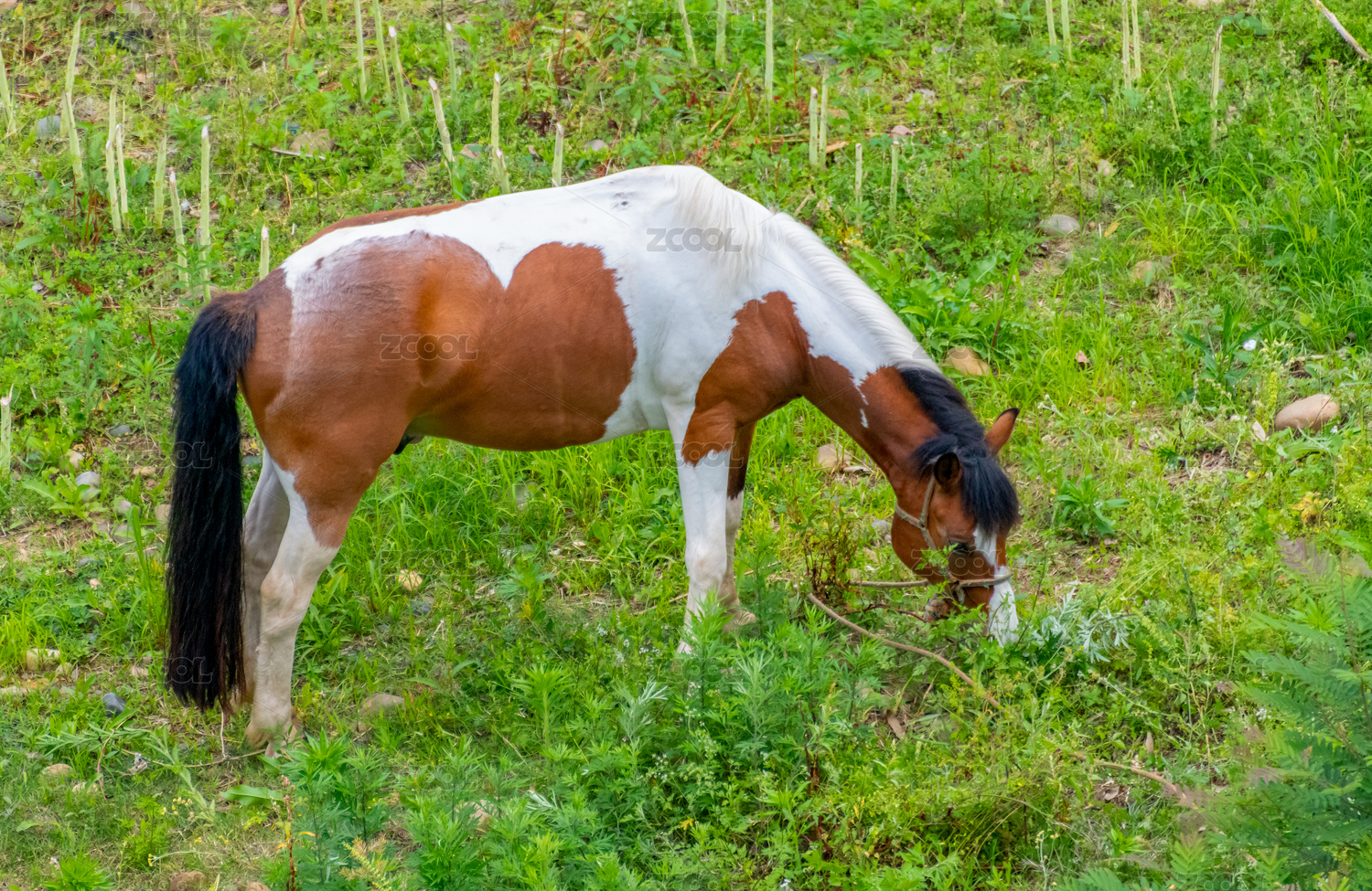 中国新疆伊犁早晨,草原上一匹正在吃草的马