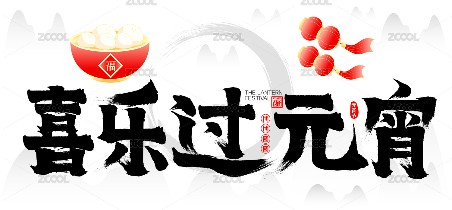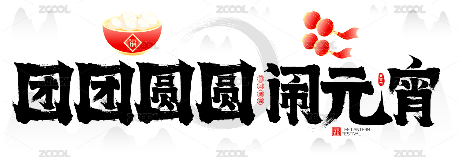 元宵佳节水墨中国风灯笼汤圆送福矢量毛笔字