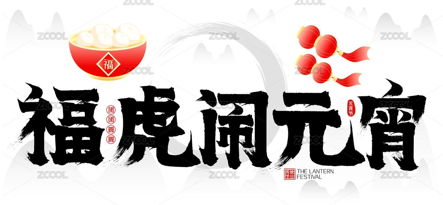 福虎闹元宵水墨中国风灯笼汤圆送福毛笔字