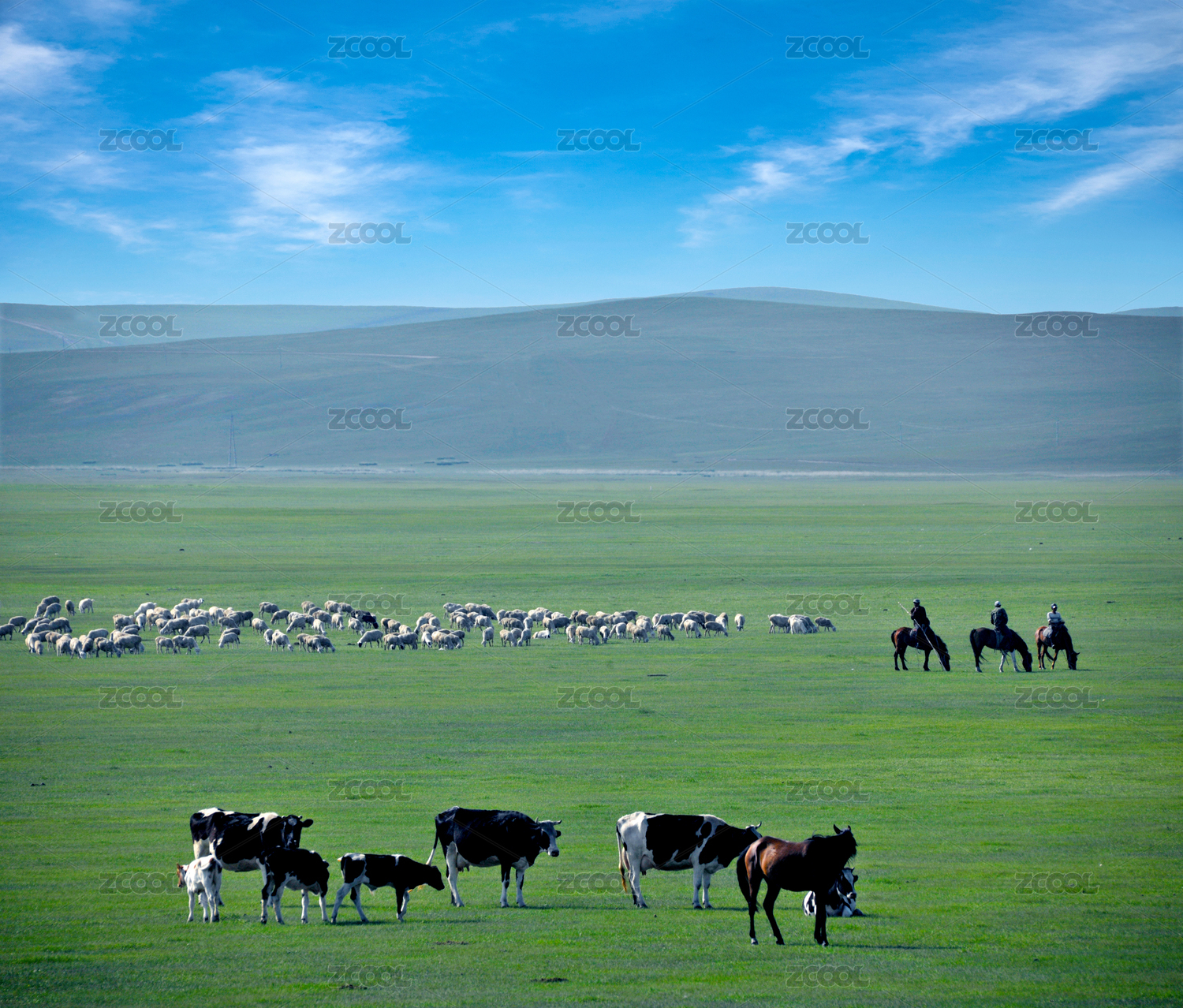 莫尔格勒河畔金帐汗草原的羊群、马群、牛群