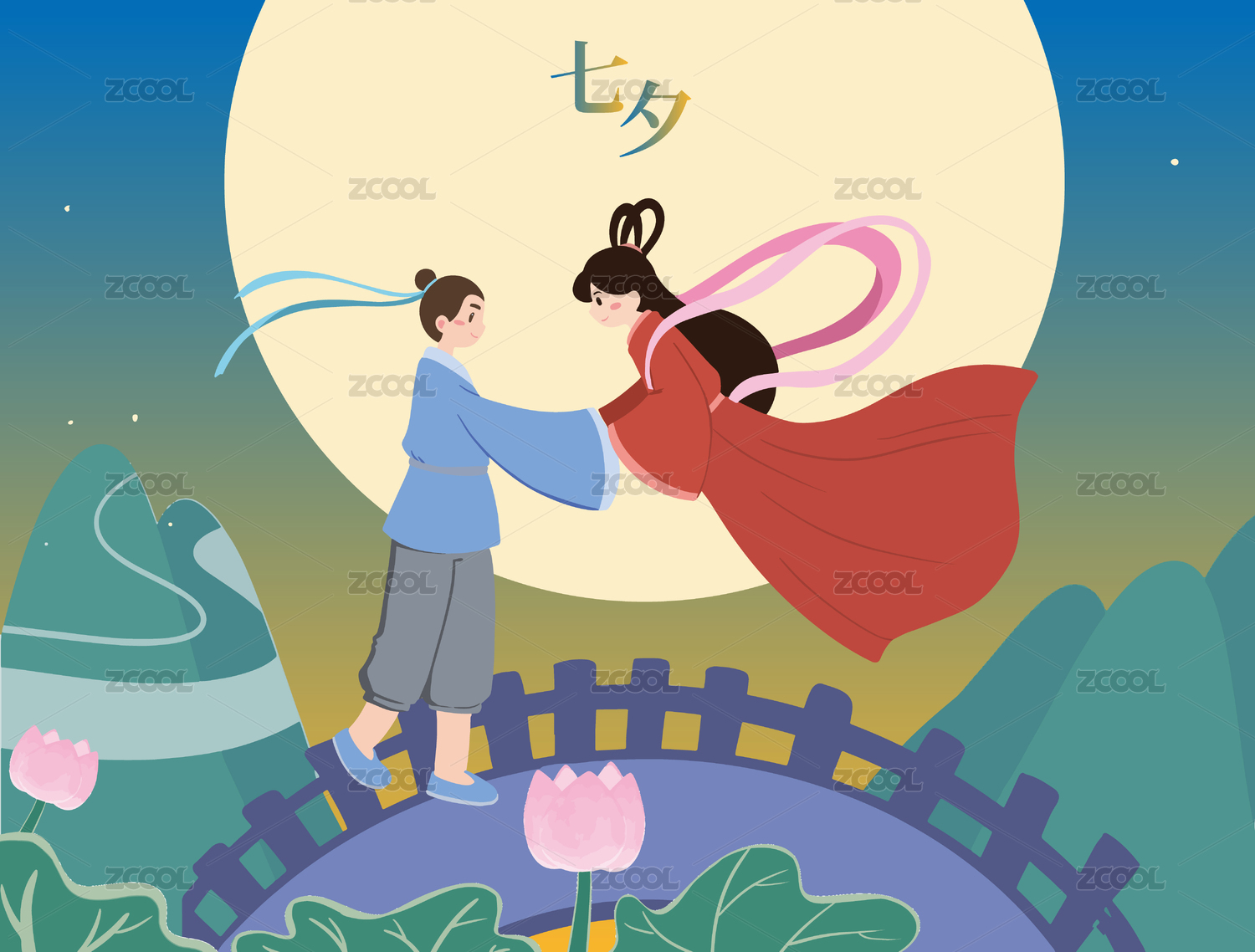 插画,插图,矢量,海报,可爱,扁平,七夕,情人节,牛郎织女,乞巧节