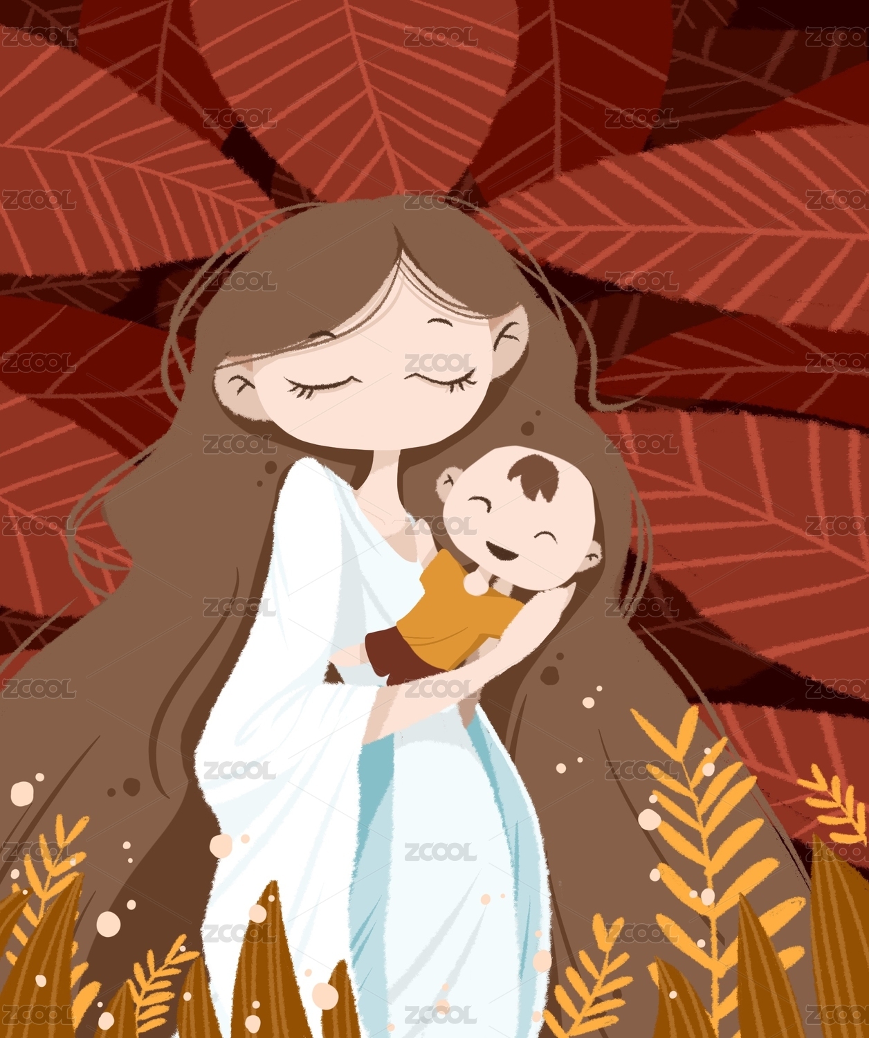 康乃馨花丛中母亲抱着熟睡的婴儿母亲节插画