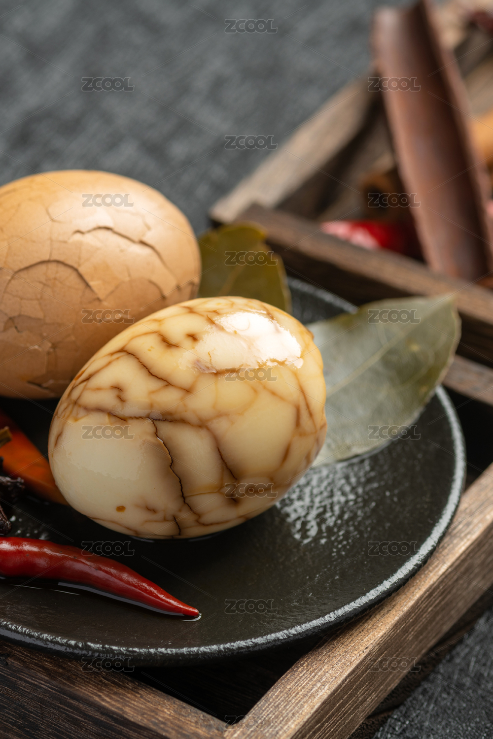 煮熟的茶叶蛋盛放在碟子和碗中摆放在桌面上