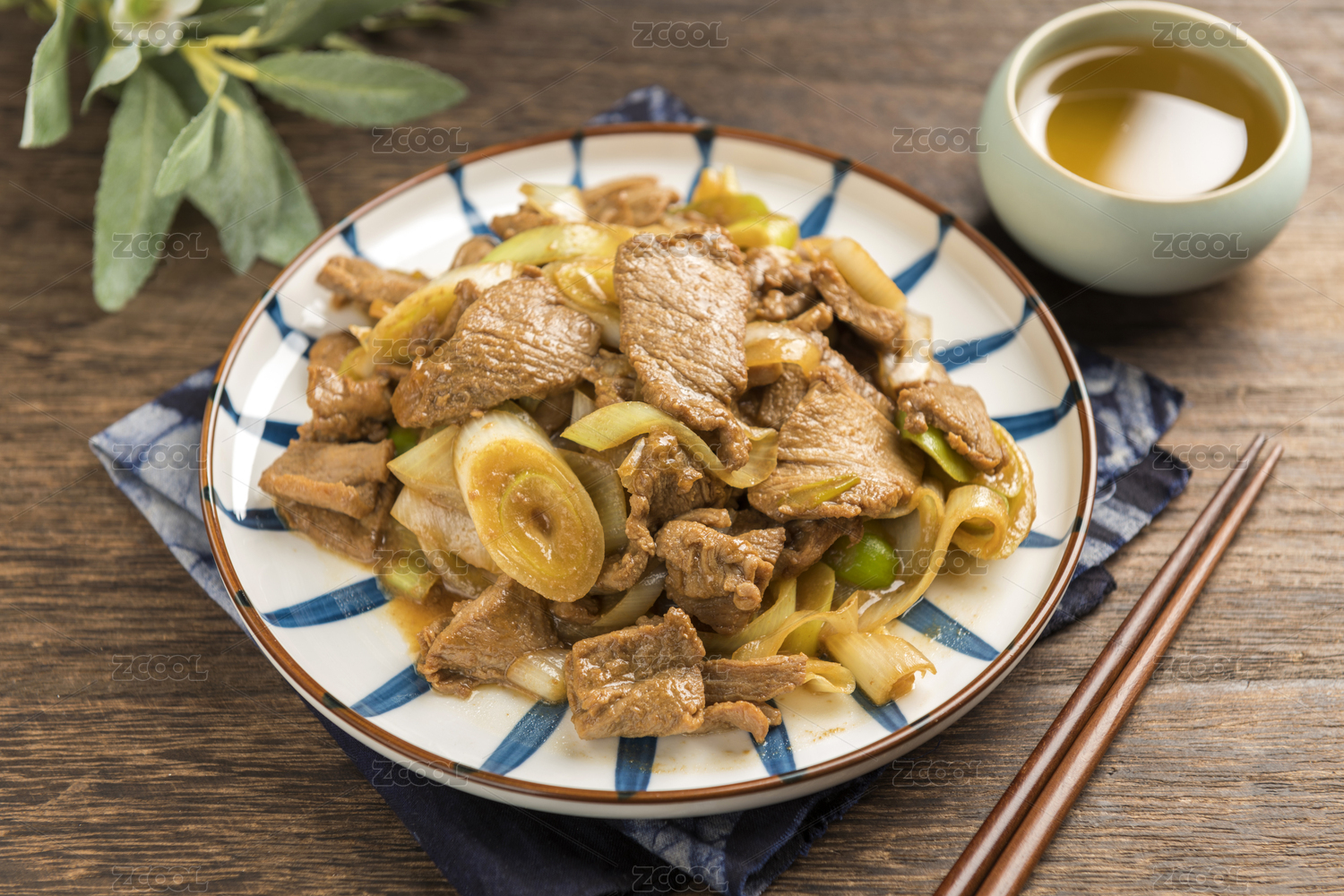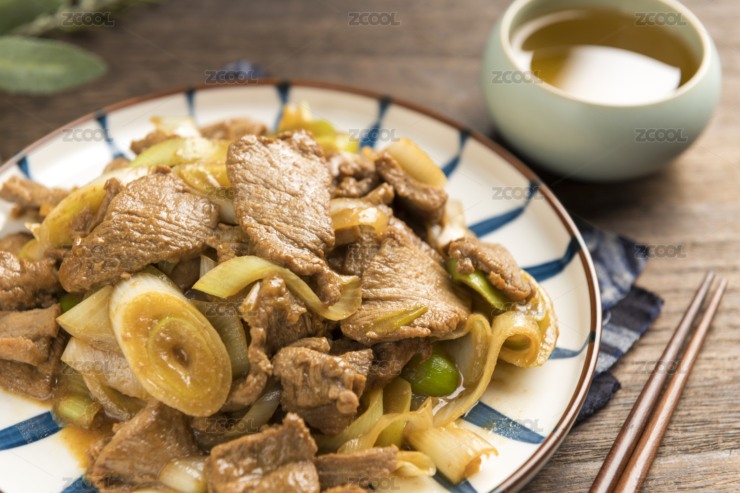 葱爆肉,葱爆肉片,肉片炒大葱,大葱炒肉片,传统鲁菜,家常菜,传统菜肴,一盘,筷子,茶水