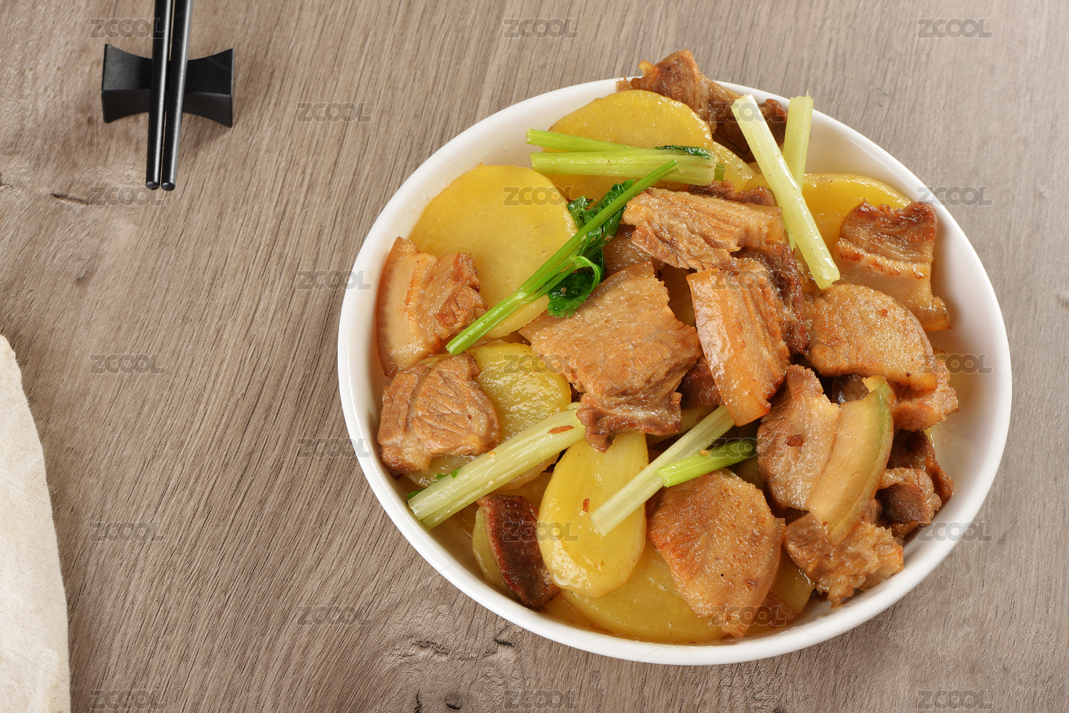 俯拍木纹桌子上的一盘中式菜土豆炒肉