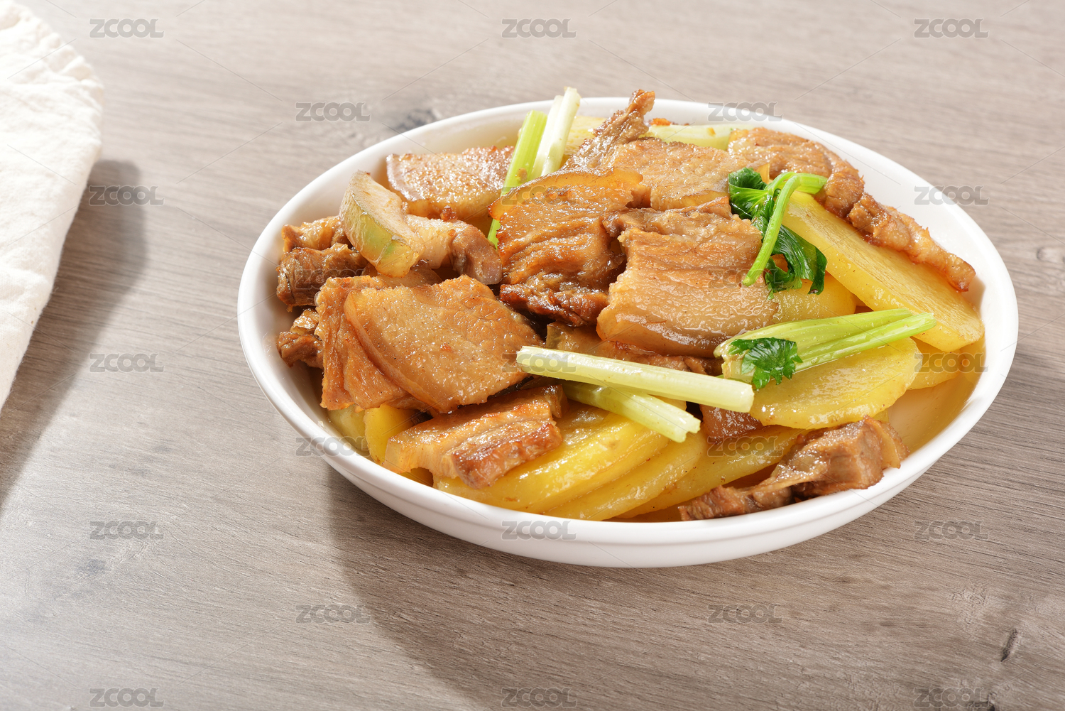 木纹桌子上的一盘中式菜土豆炒肉
