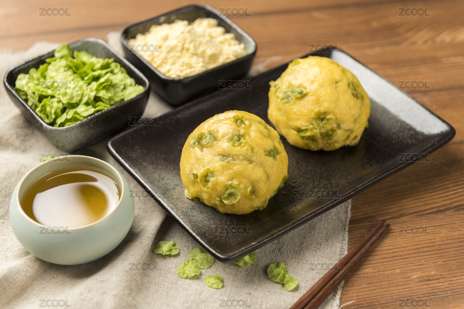 榆树钱玉米面馒头榆钱饽饽摆放在桌面上特写