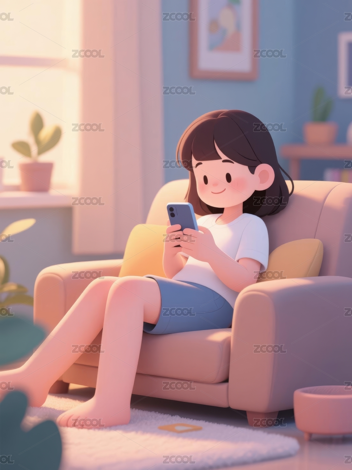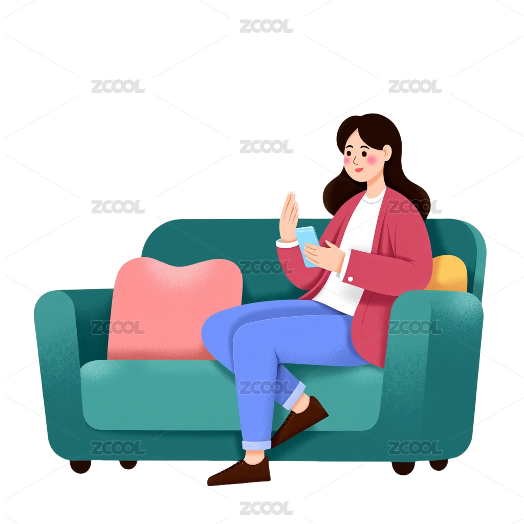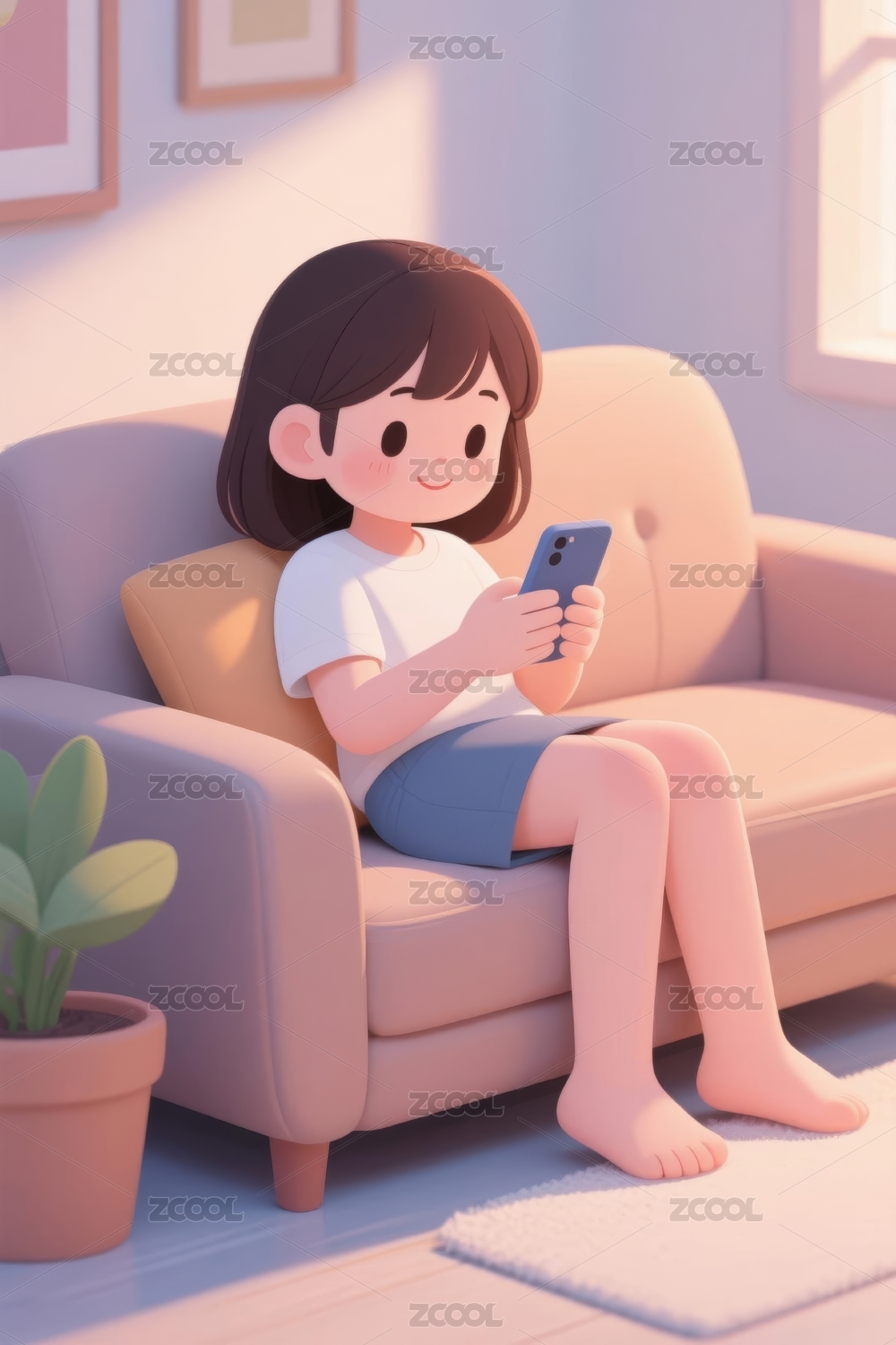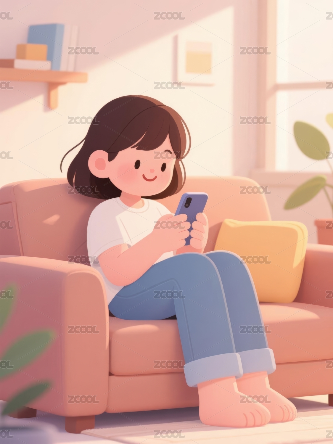 小清新手绘室内场景客厅沙发玩手机女孩插画
