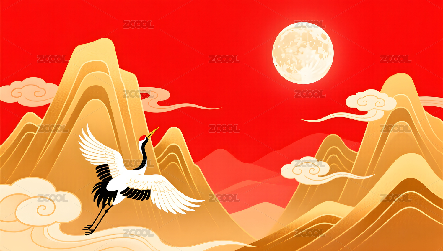 红色背景和金色线条画的山峰仙鹤和金色月亮