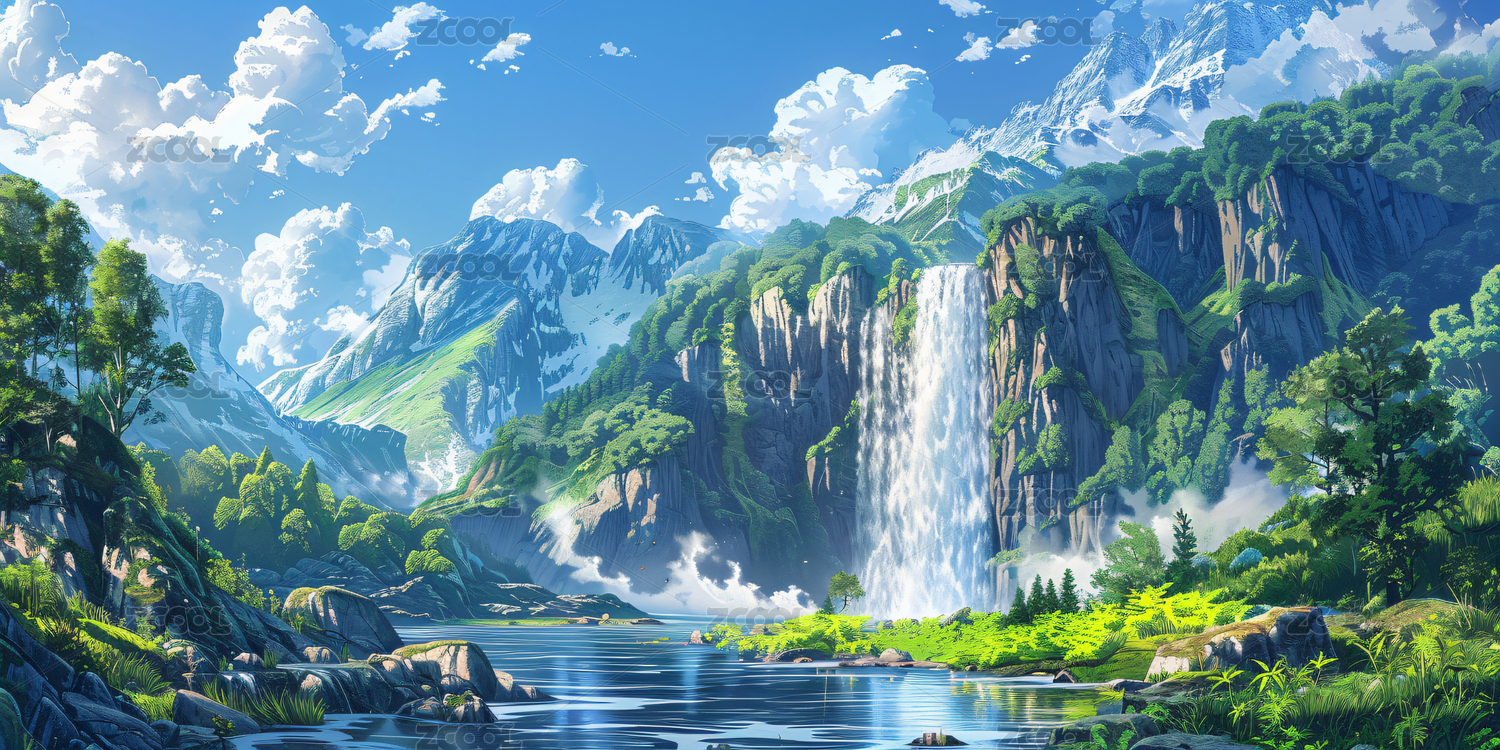 梦幻般的瀑布景观,山峦叠嶂,绿意盎然