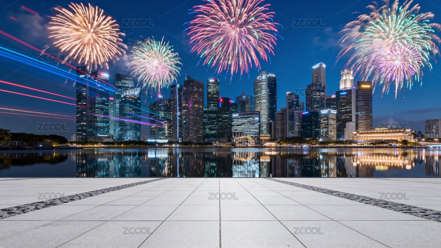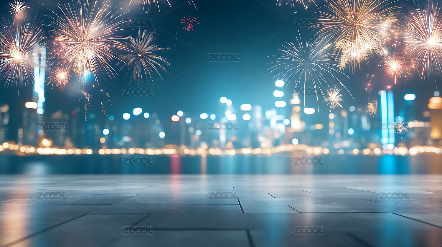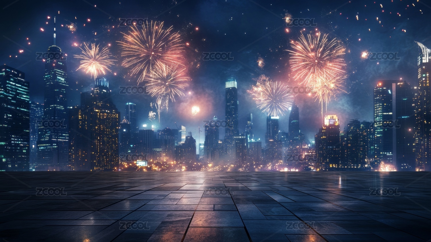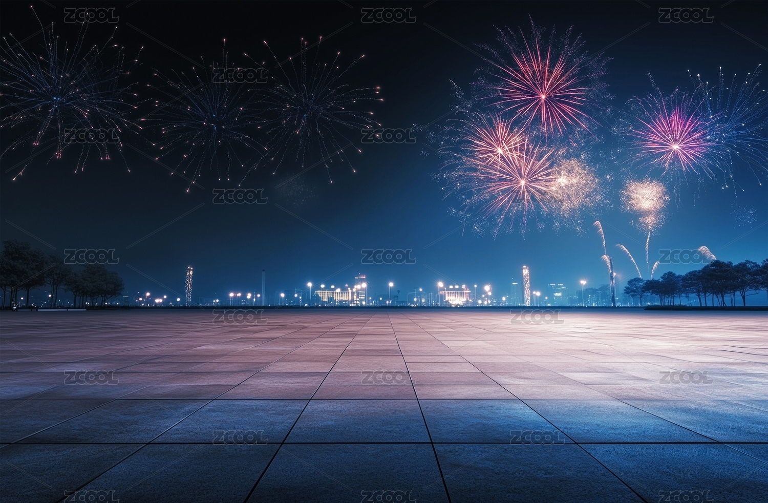 砖地广场地面平台与天空中的烟花焰火背景