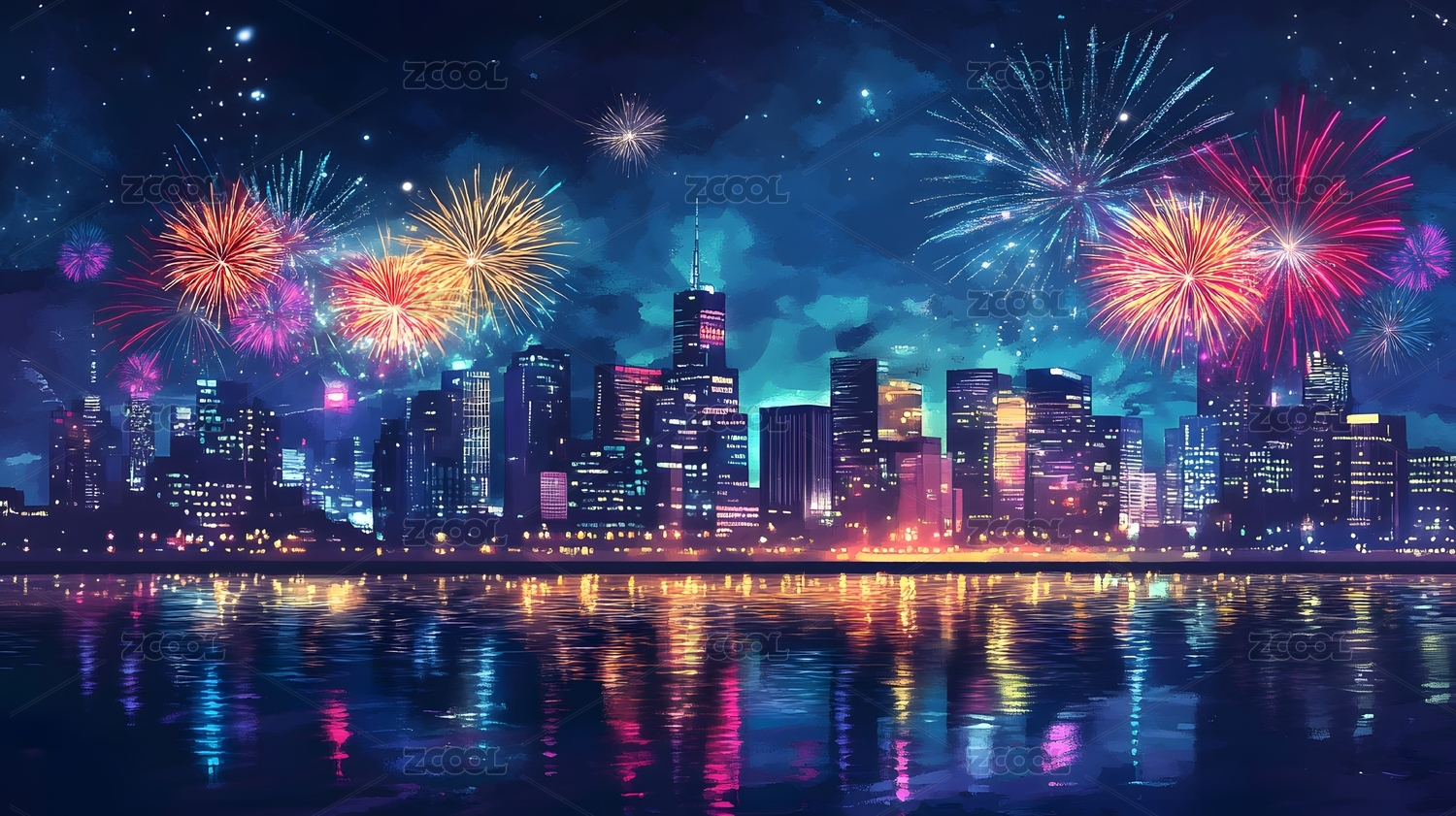 城市夜景与绚丽烟花