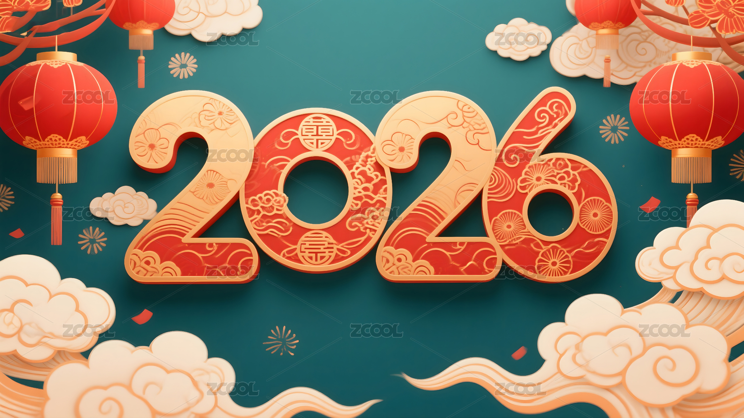 剪纸风格牡丹花灯笼喜庆“2026”背景图