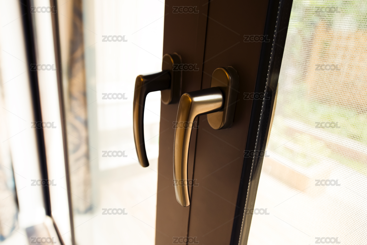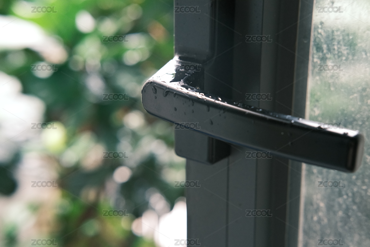 半开的玻璃推拉门与窗外茂盛的绿树模糊背景