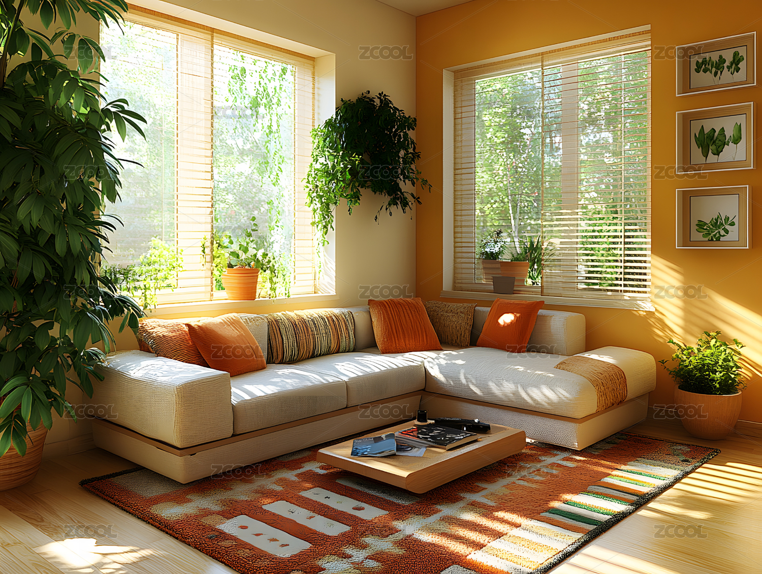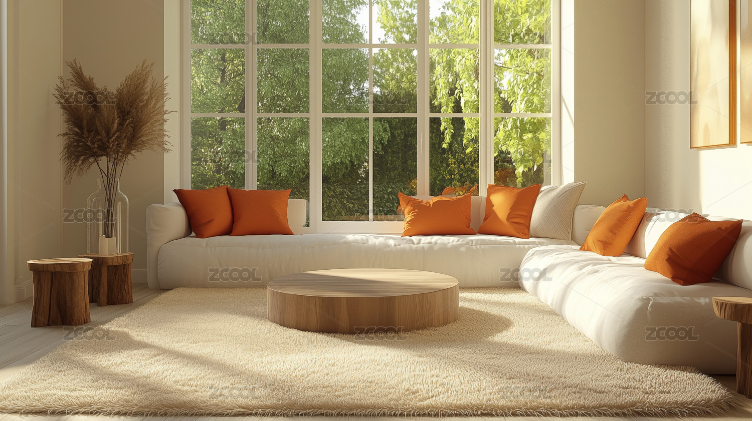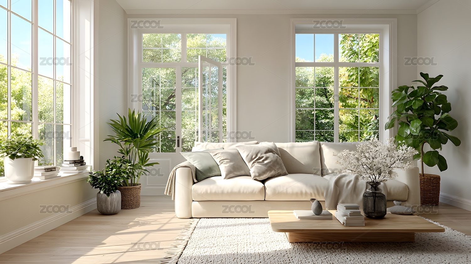 大窗绿植旁白色沙发配绿抱枕的客厅