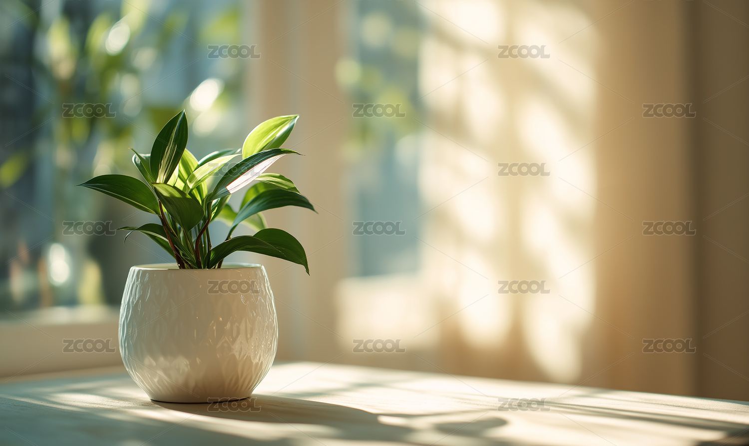 窗边桌上绿植盆栽的清新治愈摄影素材