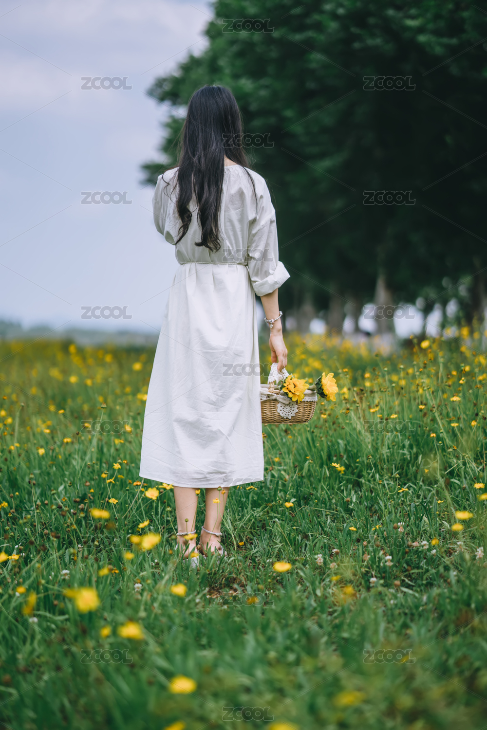手提花篮站在花海中的女孩