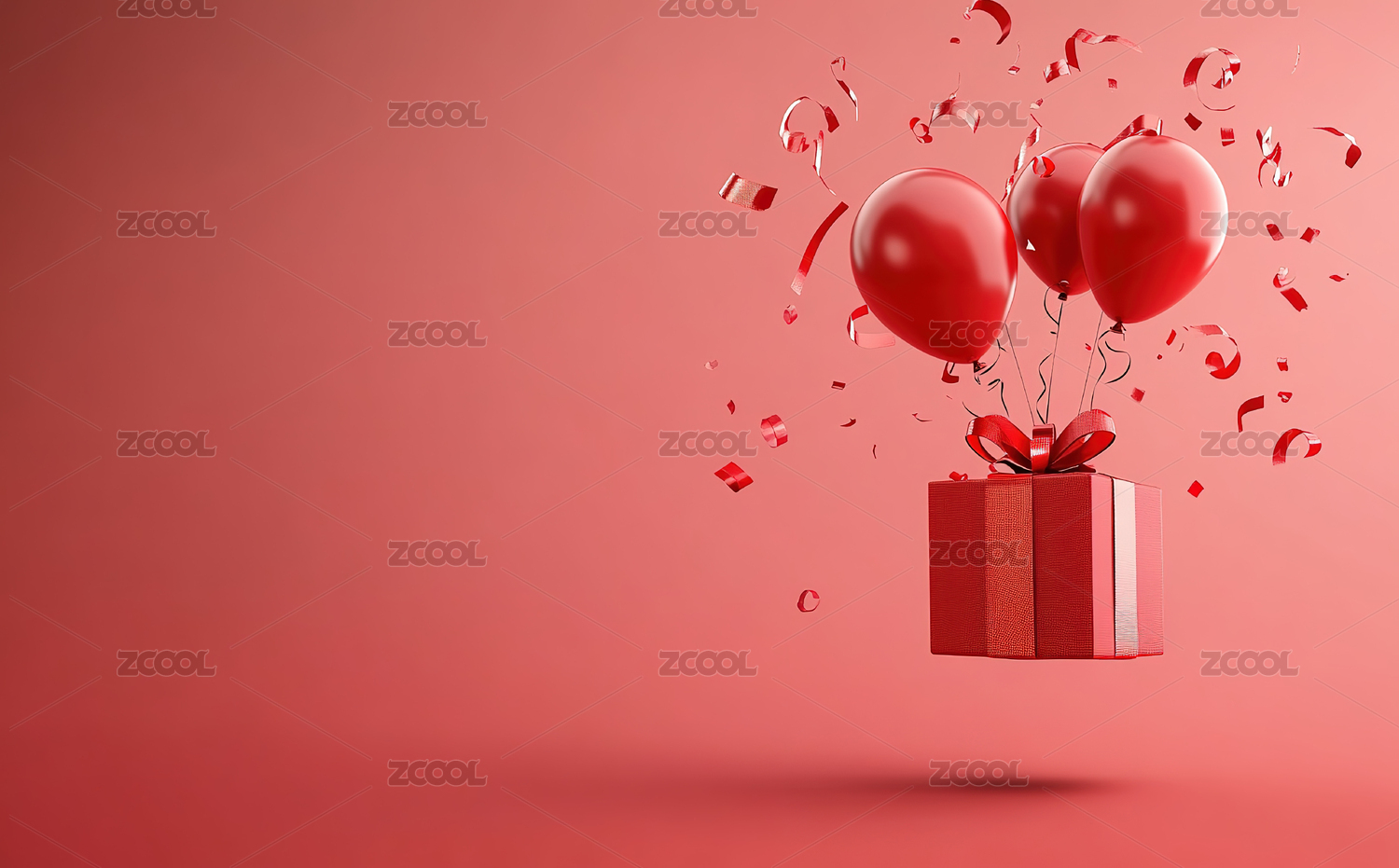 红色背景上的红色心形气球和礼物