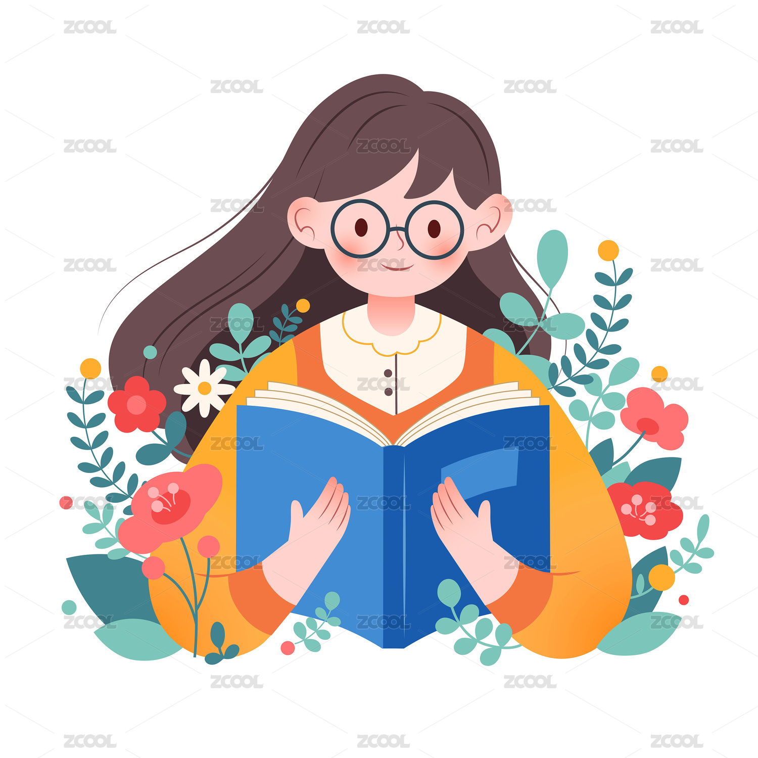 矢量插画读书日花丛中看书阅读的戴眼镜女孩