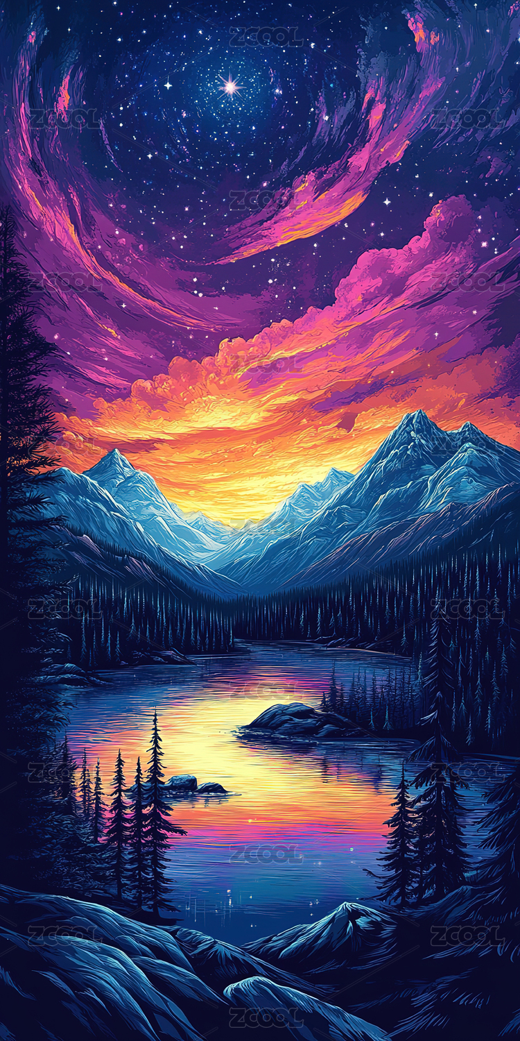 手绘唯美的抽象艺术感夜晚天空风景插画