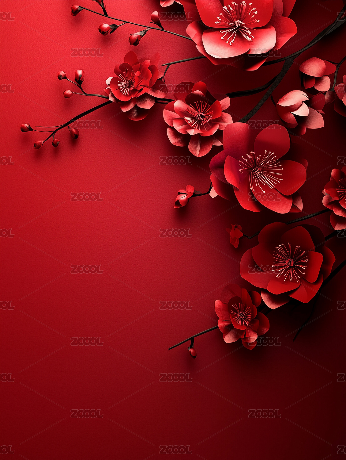 红色背景纸艺风梅花绽放喜庆氛围
