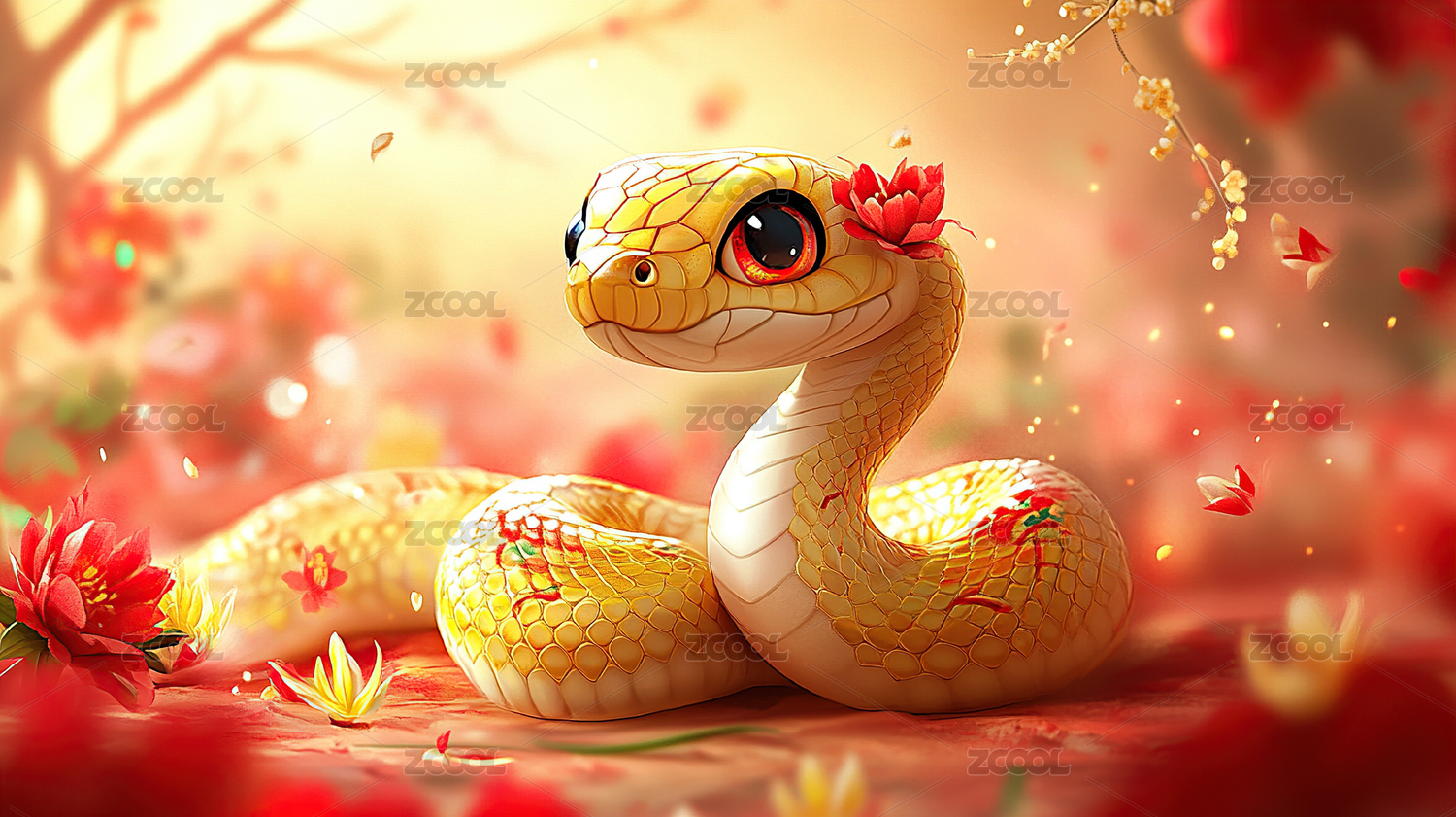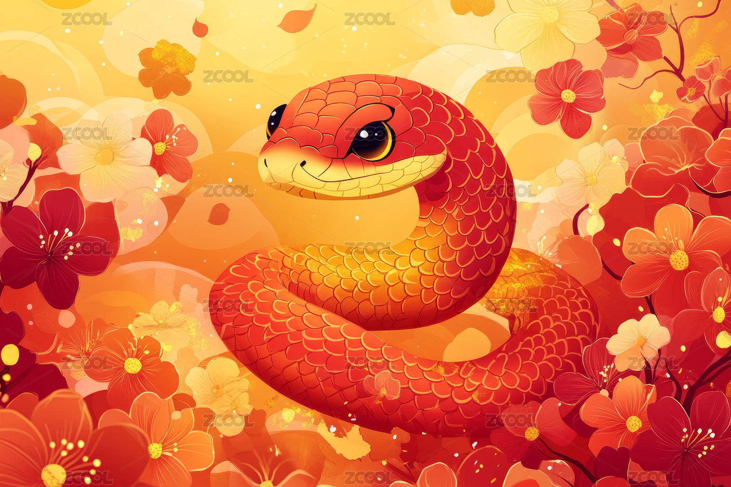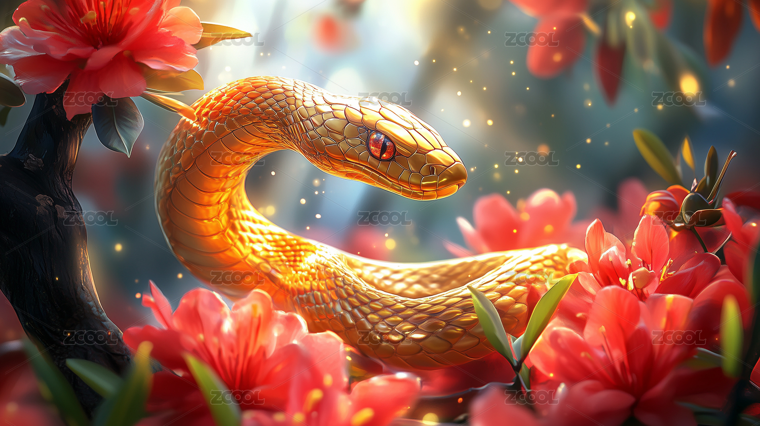 国风喜庆红色背景花丛金色蛇3D立体插画