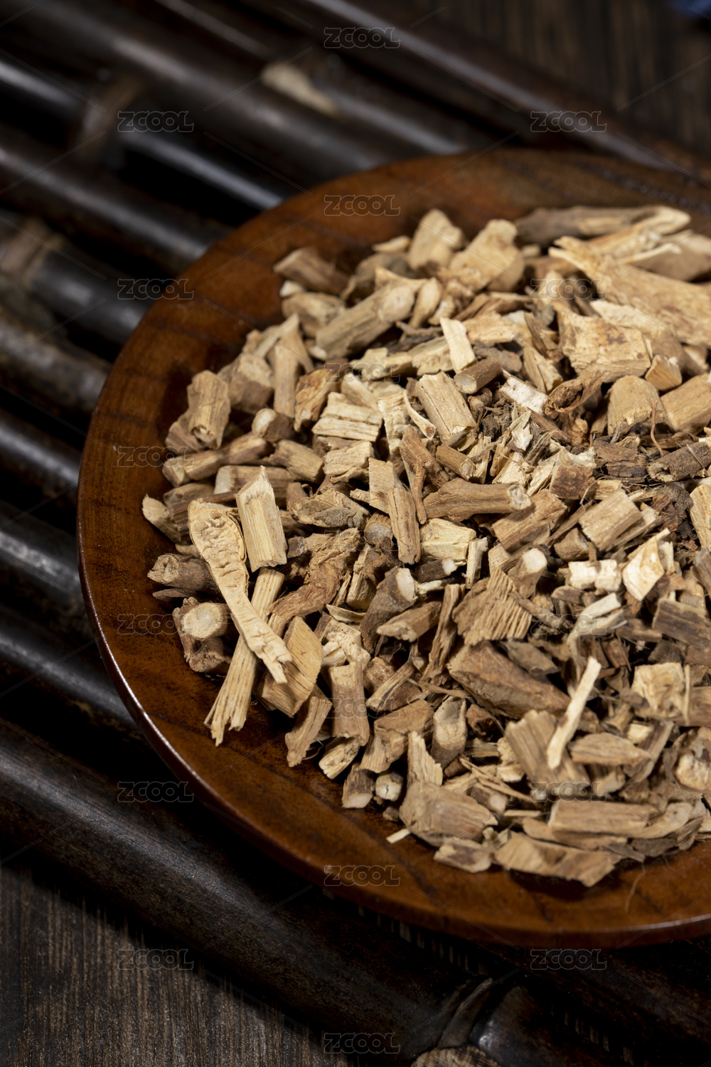 深底上放着一盘宁夏甘草片和勺子上挖着甘草