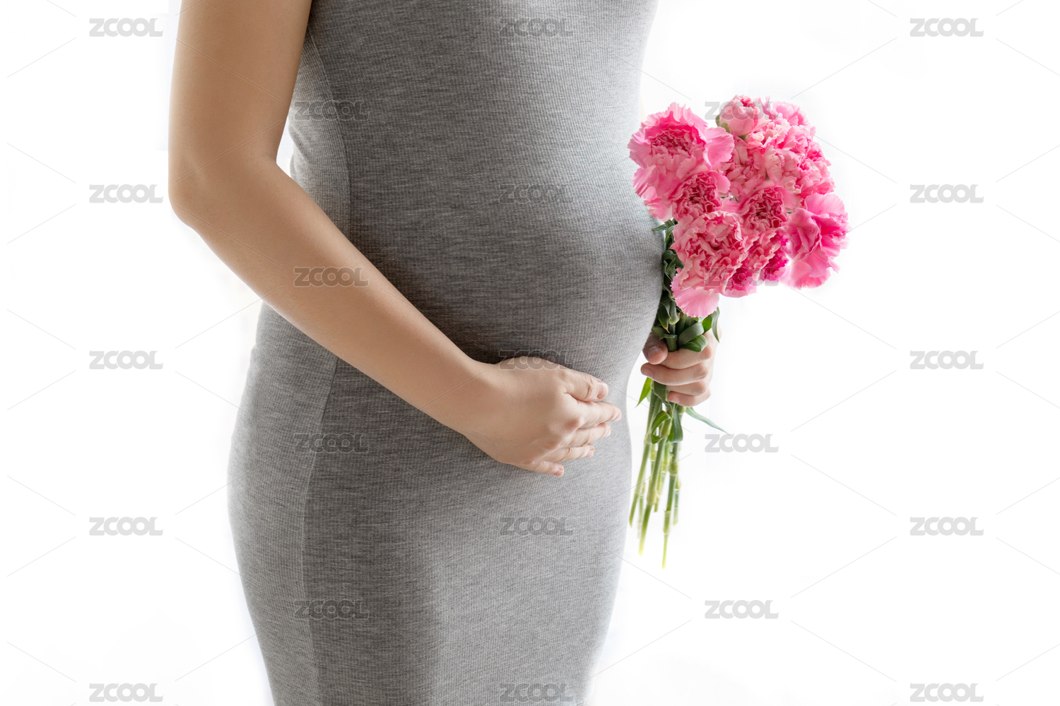 年轻孕妇拿着一束康乃馨和一张贺卡