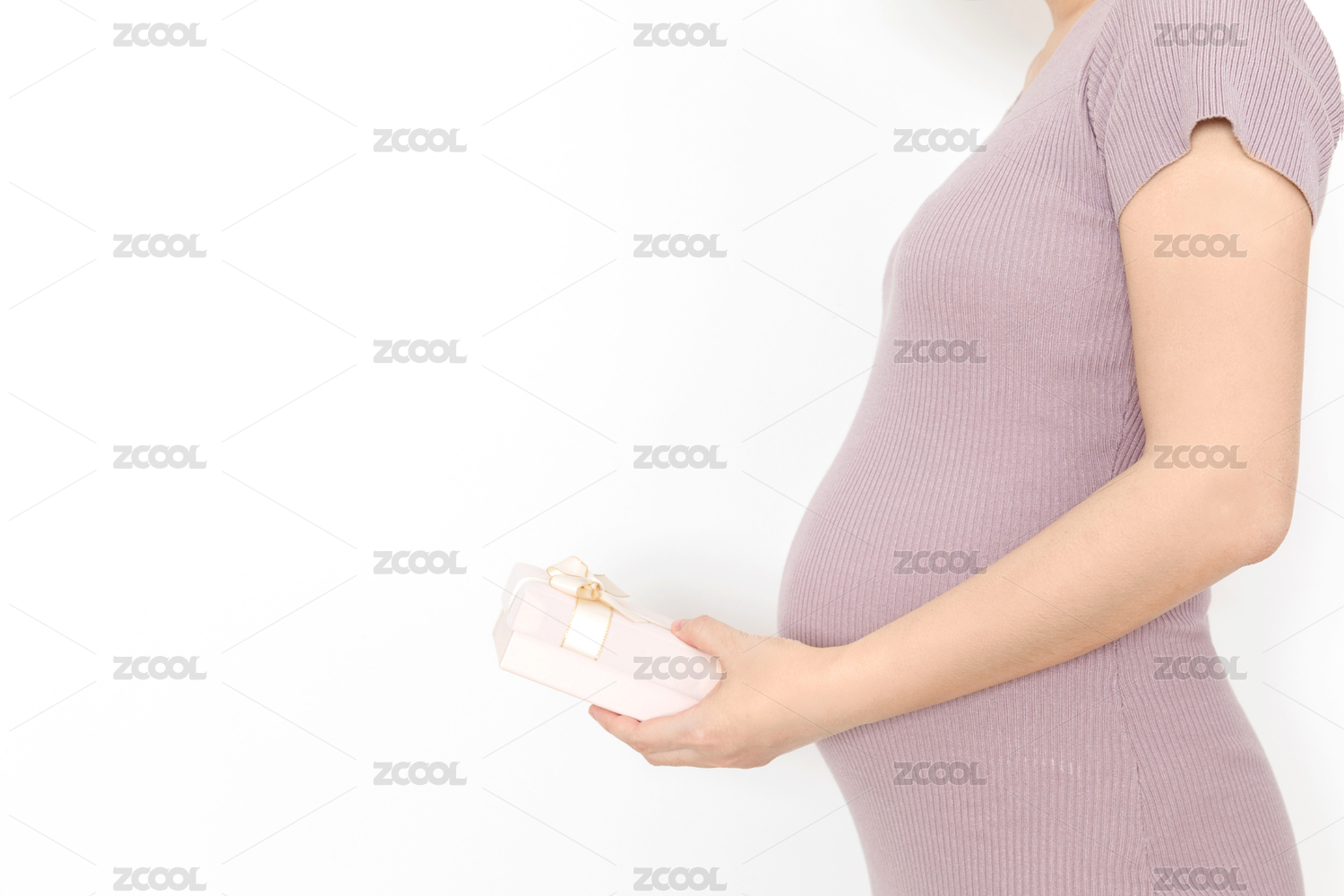 身穿紫色针织裙的年轻孕妇手拿着一个礼物盒