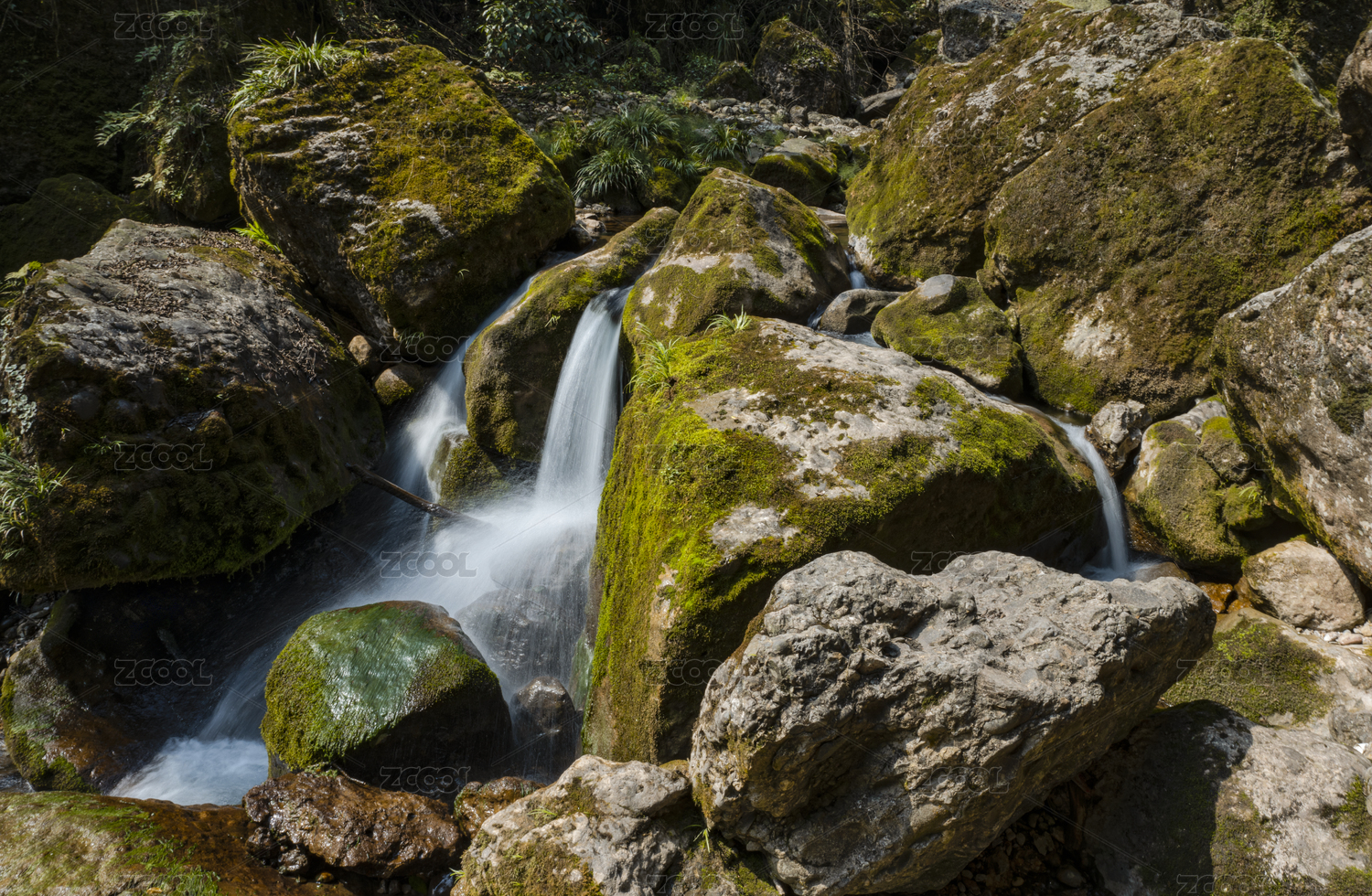 山谷中石头间流动的清澈溪水