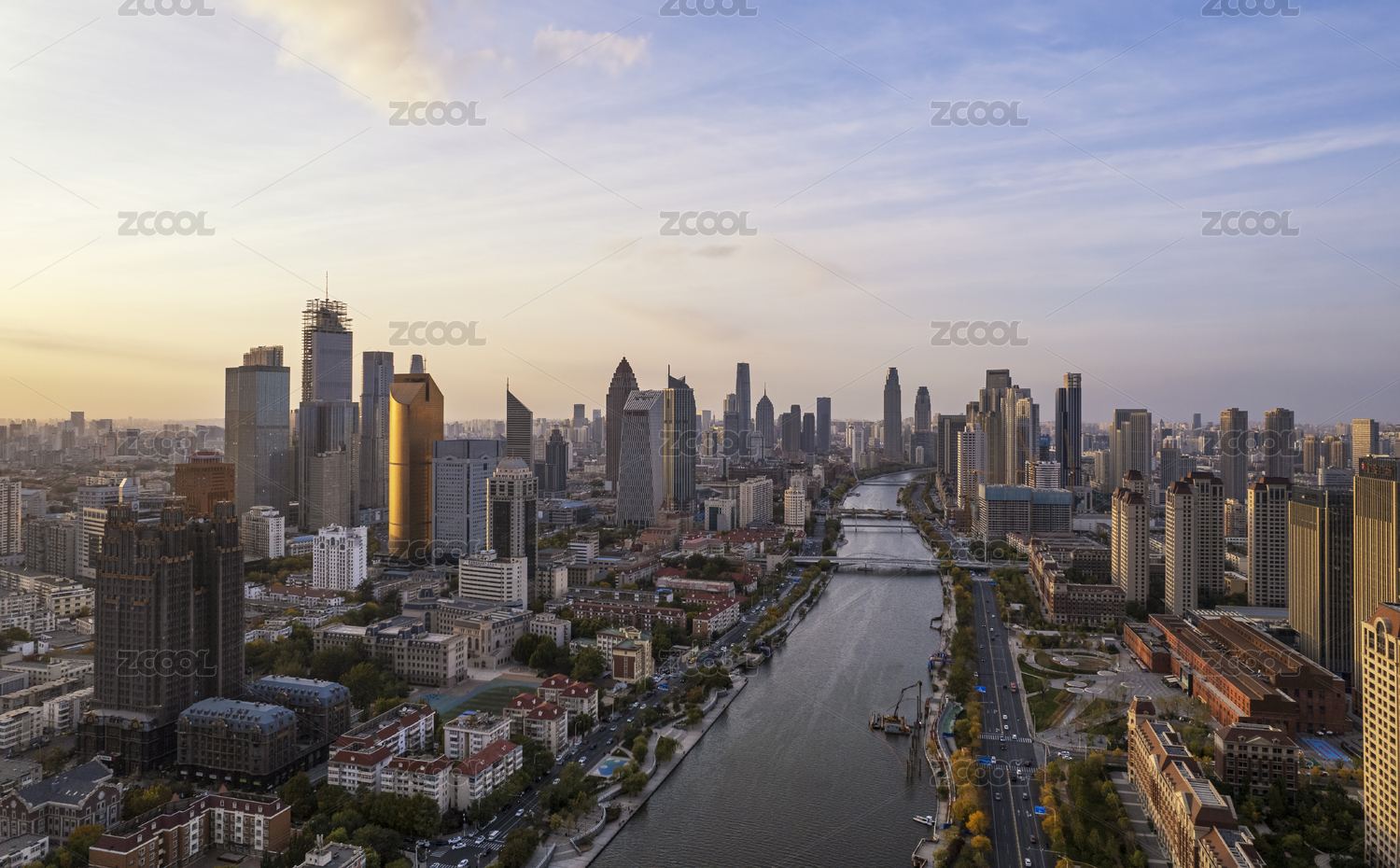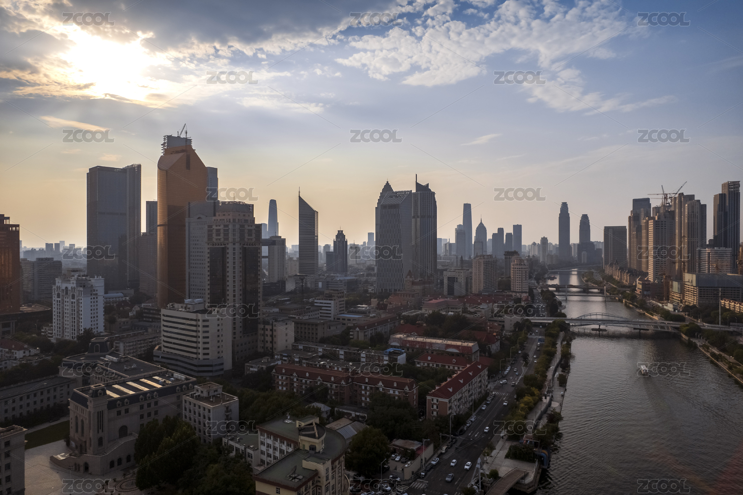 天津海河直沽桥小白楼商圈城市建筑日落风光