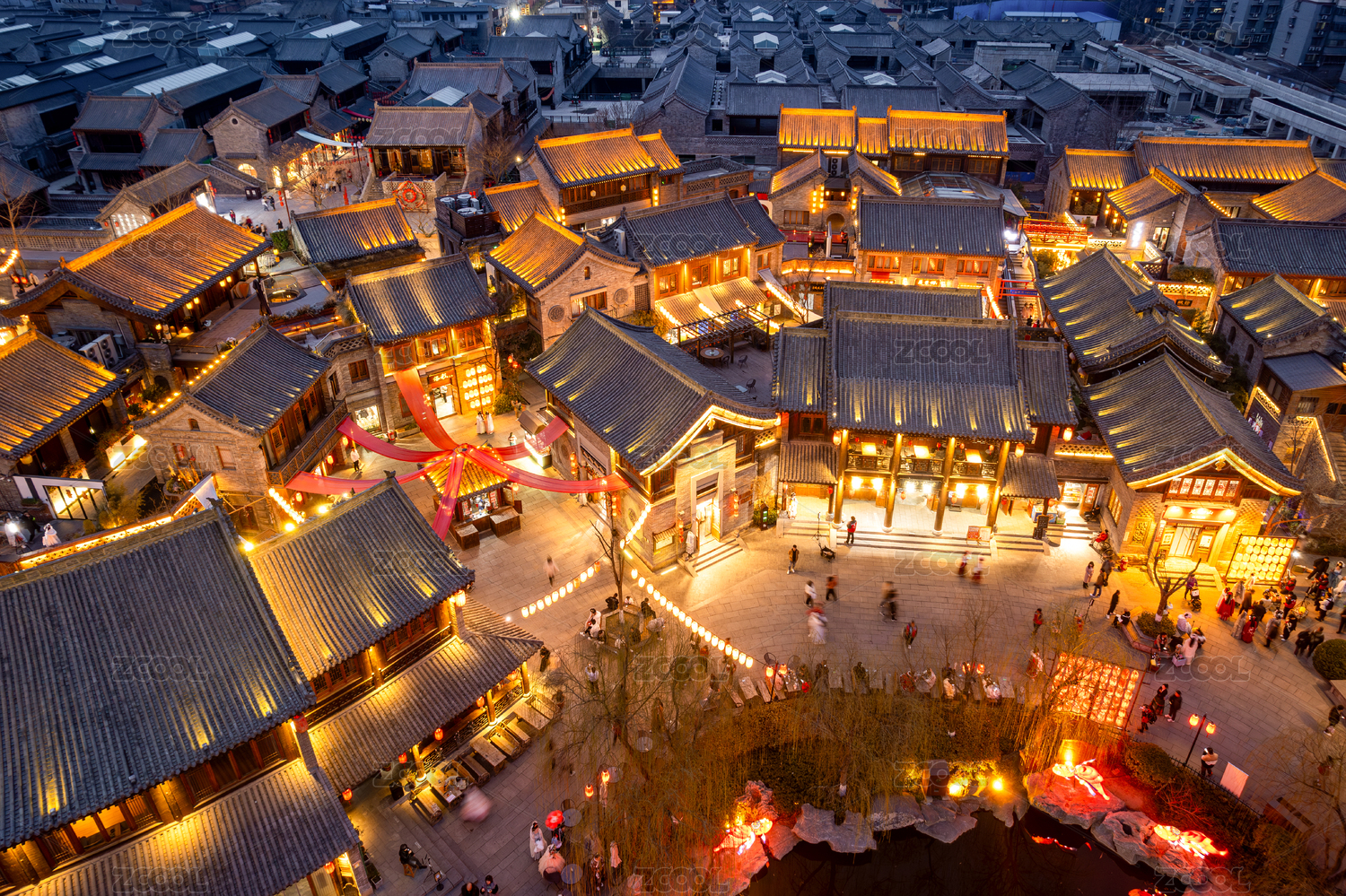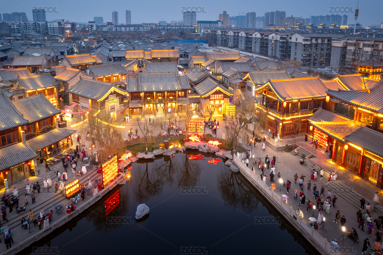 中国河南鹤壁浚县古镇夜景航拍无人灯光摄影
