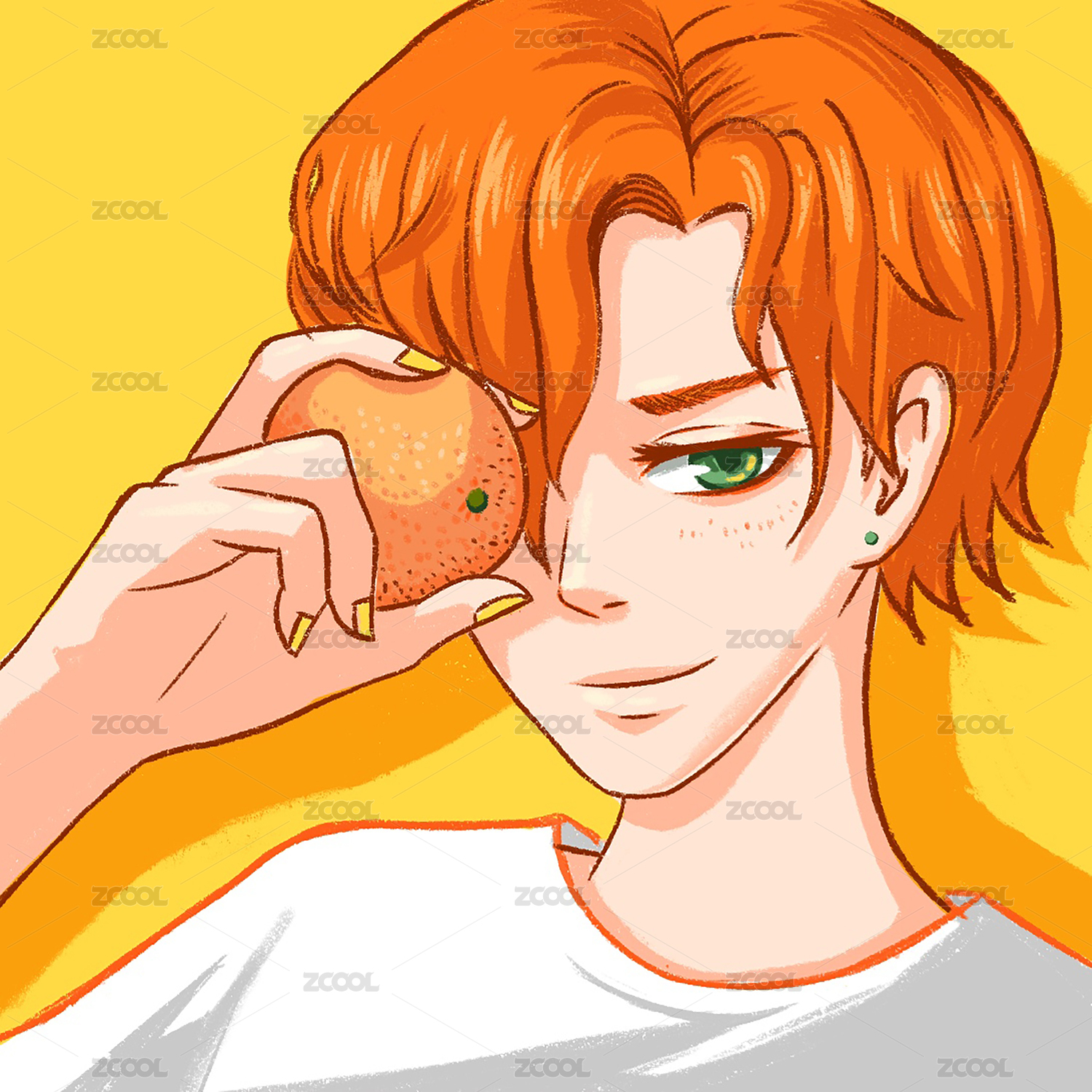 一个手拿橘子的橙发绿眼男孩,水果拟人插画