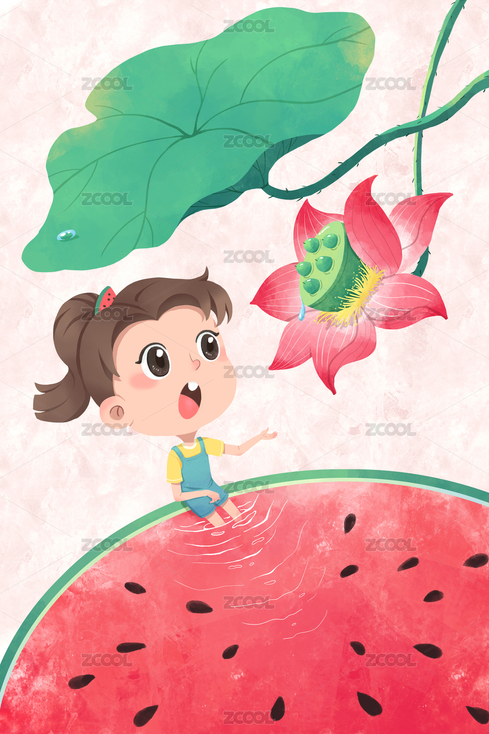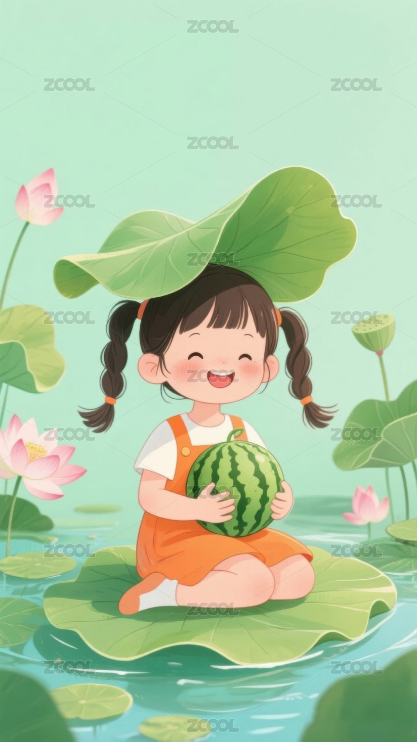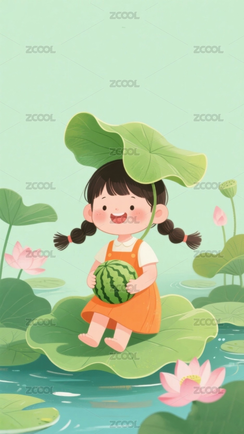 荷叶上的小女孩抱着西瓜