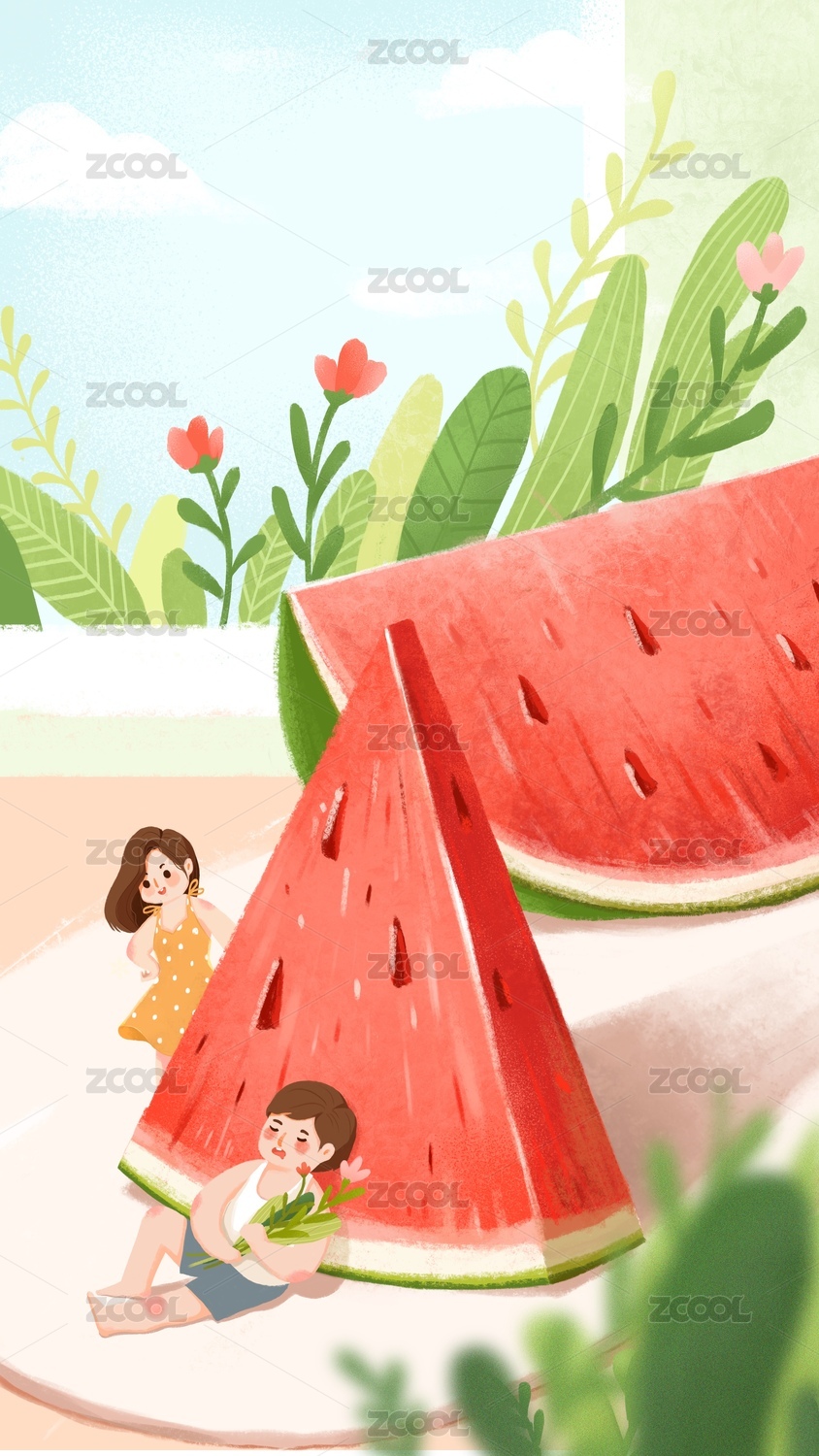 女生吃西瓜户外自然风景清新插画